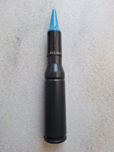 Sie bieten auf ein Patronen-Dummy im Kaliber 25 x 137 mm, der keinerlei Gefahrenstoffe enthält. Hersteller gemäß Bodenstempel ("EMZ"): Eurometaal Zaandam, Niederlande. Bei dem Geschoss könnte es sich um ein Üb-Geschoss handeln, darauf deutet zumindest die blaue Farbe der Geschossspitze hin. Wenngleich der Dummy keinerlei waffenrechtlichen Beschränkungen unterliegt, verkaufe ich diesen dennoch ausnahmslos nur an volljährige Personen, daher auch der Hinweis "Altersnachweis erforderlich", der bei ID-Mitgliedern entfällt. Munition dieses Kalibers wird z.B. in der M242 Bushmaster Maschinenkanone verwendet. Der Dummy besteht aus einer abgeschossen Hülse (ohne Zündhütchen) sowie einem Geschoss, welches nur lose auf die Hülse aufgesetzt ist, d.h. das Geschoss ist nicht fest mit der Hülse verbunden. Das Geschoss ist im unteren Teil aus Metall gefertigt, der Rest besteht aus Kunststoff (schwarzer und blauer Teil). Eine kleines Papp-Röhrchen zur Aufbewahrung des Geschosses gehört ebenfalls zum Lieferumfang. Das Bild zeigt den Artikel, auf den Sie bieten. Versicherter Versand mit Sendungs-ID. Kein internationaler Versand, d.h. Versand nur innerhalb Deutschlands ! Da es sich um einen Privatverkauf handelt, der keinen gewerblichen Hintergrund hat, ist jede Garantie oder Gewährleistung ausdrücklich ausgeschlossen; ebenso ist eine Rücknahme der Ware nicht möglich oder mit anderen Worten: DER VERKAUF ERFOLGT UNTER DEM AUSSCHLUSS JEGLICHER SACHMÄNGELHAFTUNG. Mit der Abgabe eines Gebotes akzeptieren Sie diese Bedingungen; bitte bieten Sie also nicht, wenn Sie mit den vorgenannten Bedingungen nicht einverstanden sind. MyGun ist Bestandteil dieser Auktion. ebenfalls zum Lieferumfang.