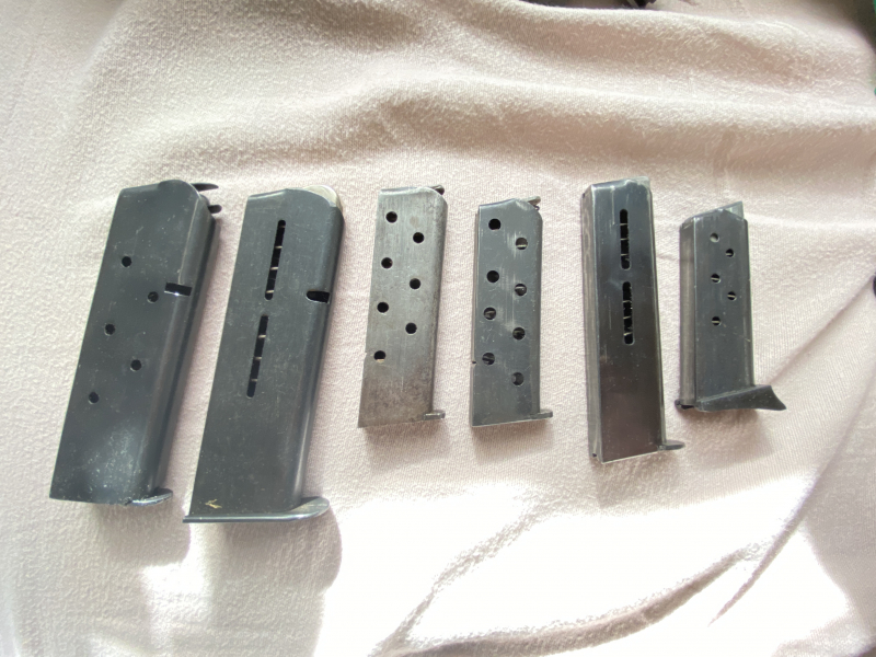 Aus einem Nachlass kommen 6 mir unbekannte Magazine zur Auktion. 2 Stück sind für die Patrone 9X19. Zwei sind vermutlich für die 7,65 und 2 Magazine sind vermutlich für Schreckschusspistolen.