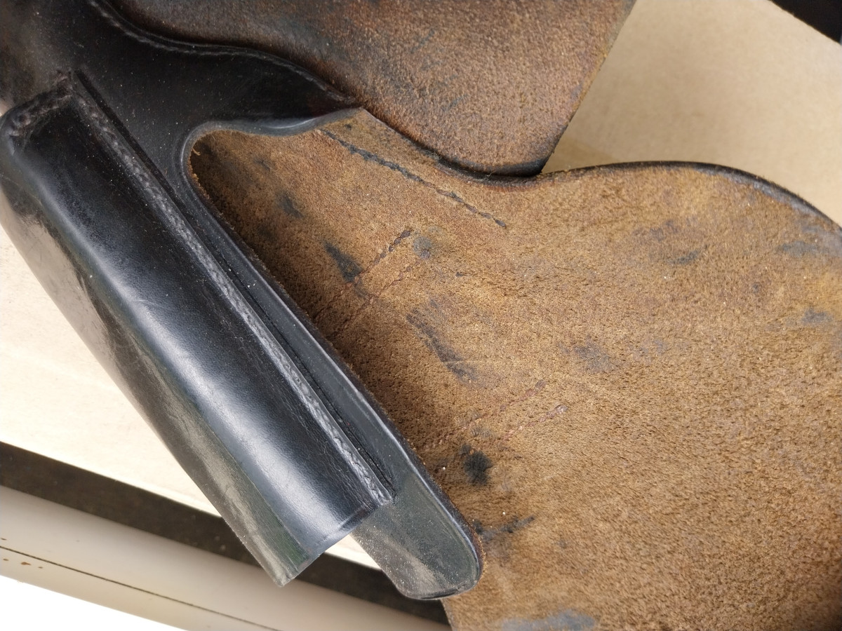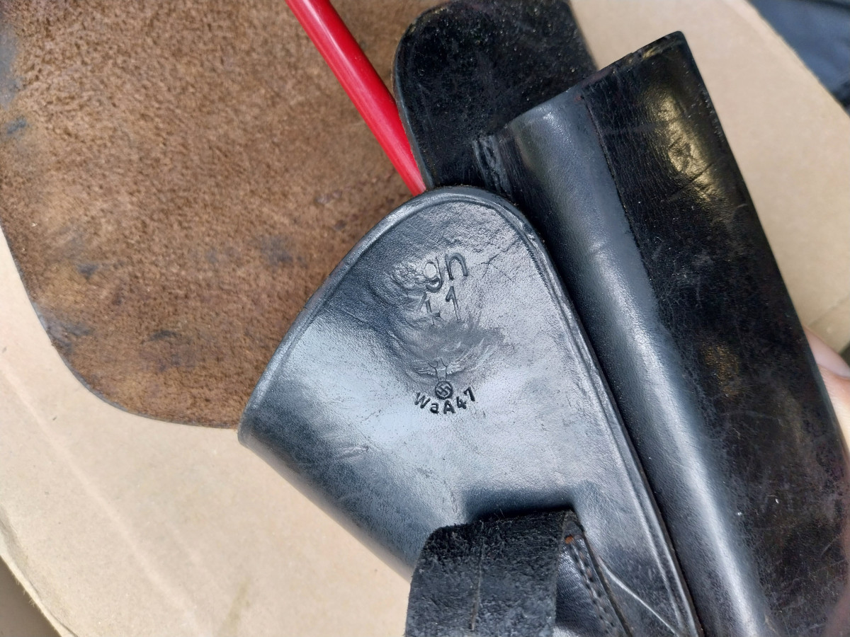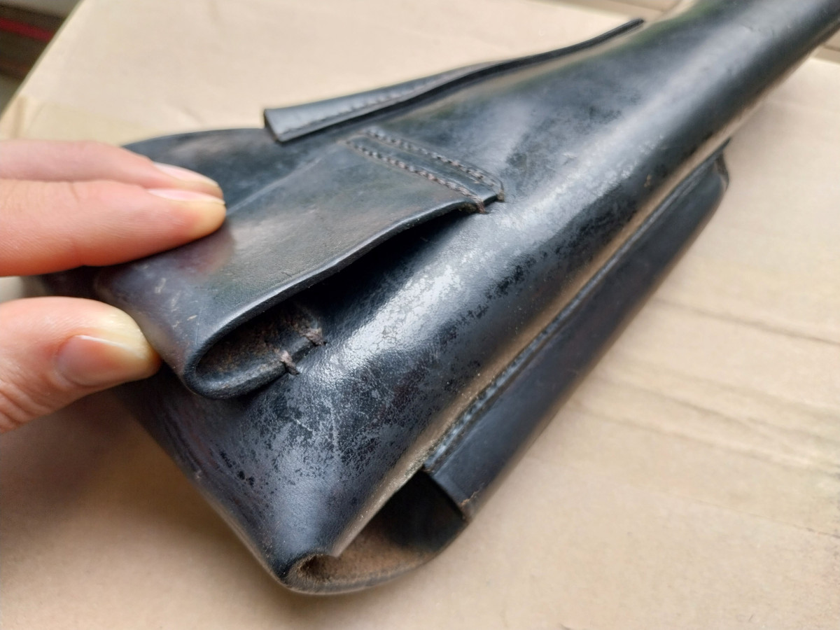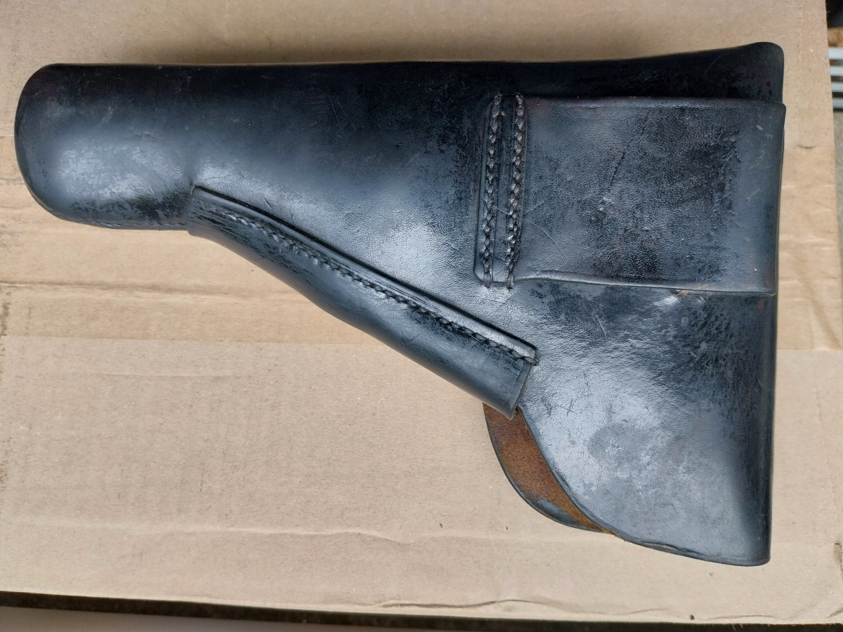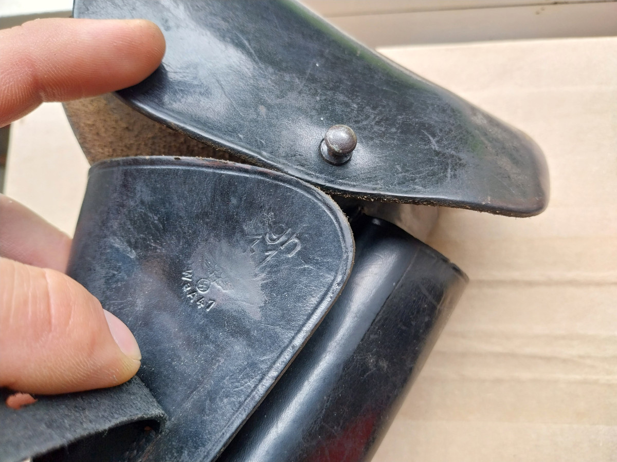Zur Auktion kommt ein sehr gut erhaltenes Holster für die Wehrmachtspistole FN High Power HP 35. Bei der Wehrmacht wurde die Pistole als Pistole 640 (b) geführt und unter Aufsicht ab 1940 bei FN in Belgien für das Heer und die Waffen SS hergestellt. Das Holster besitzt unter der Verschlusslasche den Herstellercode cgn 41(Rohrbacher Lederfabrik, Josef Poeschels Soehne, Rohrbach 1941) und den Abnahmestempel WaA47. Alle Nähte sind unbeschädigt, das Leder ist nicht brüchig oder anders beschädigt.