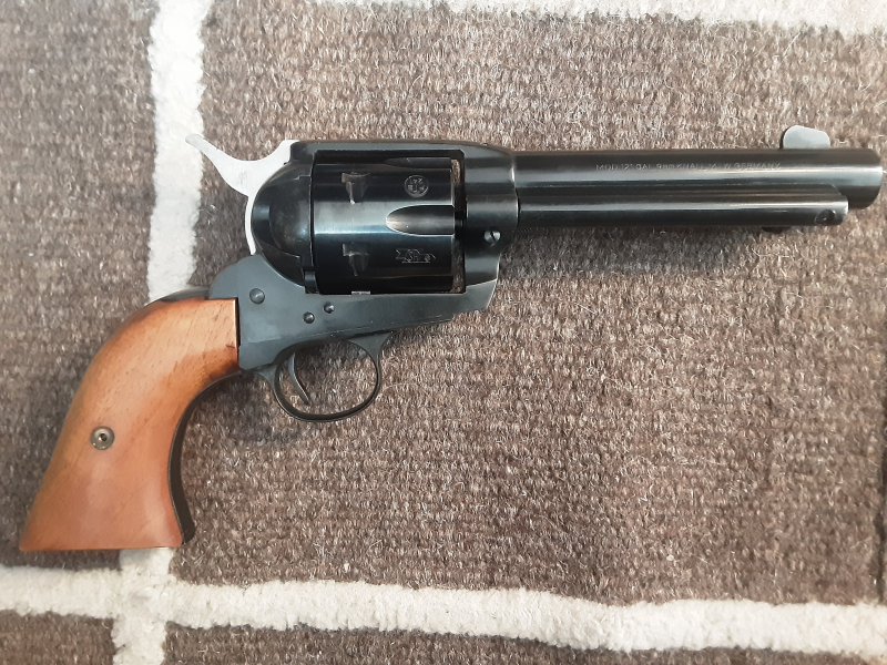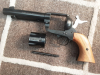 Single Action Revolver H S Model 121 Texas Scout " Frontier " Sechs Schuss im Kaliber 9mm Knall. Integrierter Abschussbecher. Ausschuss nach vorne durch den recht offenen Lauf. Trommelbohrungen versetzt. Trommel aus Stahl. Griffschalen aus Holz. Bei diesem Modell lässt sich der Lauf gut reinigen. Die Waffe funktioniert einwandfrei. Gebrauchsspuren sind vorhanden. Für die über 40 Jahre sieht der Revolver noch gut aus. Kein weiteres Zubehör.
