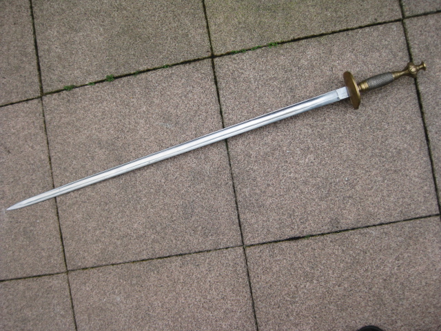 In der Auktion ist dieser beschädigte IOD a.Art. Bei einem Sturz brach augenscheinlich der Griffbügel ab und gilt verlustig. Saubere, polierte Stahlklinge vom Hersteller Weyersberg in Solingen. Klingenlänge = 80cm. Alle Teile mit Abnahmemajuskeln versehen. Ausgebaut wurde der Sockel des beschädigten Griffbügels. Die innere, gefederte Parierklappe ist vorhanden. Die äußere Klappe hat durch den Sturz auf der Innenseite eine Rißbildung im Messing, ist aber reparabel. Schönes Stück Blankwaffe zum Ergänzen oder zum Ausschlachten als Ersatzteilträgers.