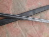 Scheide in stabilem Zustand, Nähte geschlossen. Auf der Vorderseite ein Knick. Dieser ist aber nicht auf der Rückseite vorhanden, somit ist die Scheide noch stabil.