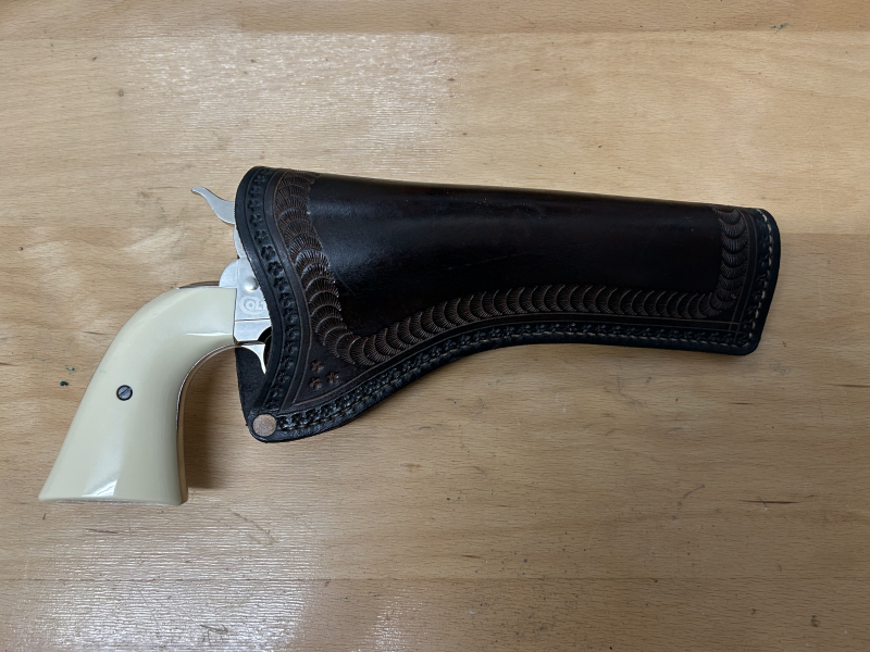 Revolverholster dark brown für Peacemaker 5,5" das Holster nimmt auch Waffen mit 7,5" Lauf auf, da unten offen. Vorderladerrevolver mit geschlossenen Rahmen passen auch gut nur der open Top Revolver fällt etwas tiefer in das Holster. Für Gürtelbreiten bis 8 cm, stabiles dickes Leder, Handarbeit Maker unbekannt schöne Punzieren. Holsteröffnung authentisch mit Kupferniete.
