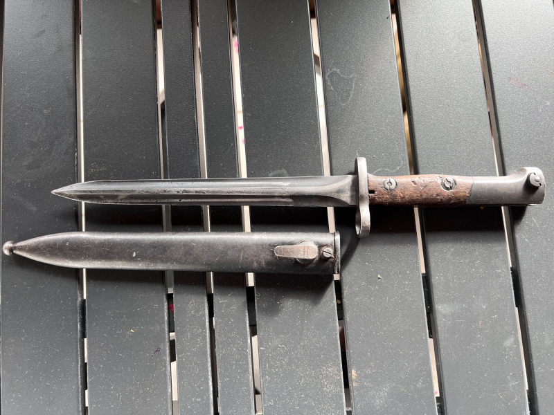 Bajonett Spanien Mauser M43. Diverse Stempel wie abgebildet. Zustand siehe Bilder. Knopf beweglich. Kinge sehr schöner Zustand.
