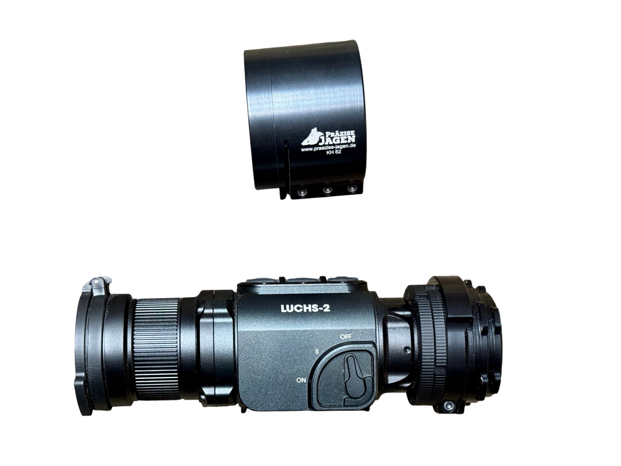Das Vorsatzgerät kommt nebst der originalen Verpackung und dem dazugehörigen Ladekabel ebenso mit dem passenden Adapter der Marke Präzise Jagen, welcher auf der, in einer vorangegangenen Auktion angebotenen Blaser R93 und somit an einem Zeiss Victory V8 2,8-20x56 M montiert war.