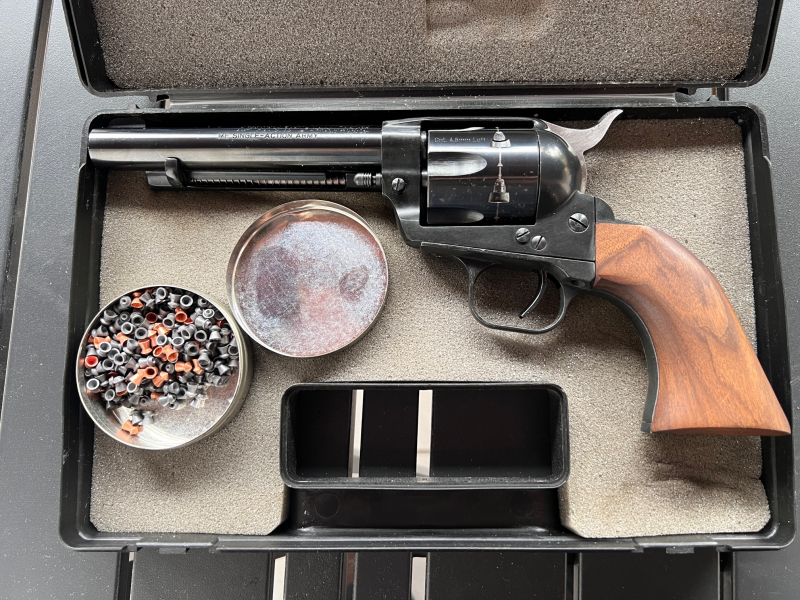WE Single Action Army, Made in Germany, Cal. 4,5 Luft. Lieferumfang wie abgebildet. Zum schießen werden noch Druckluftpatronen benötigt, diese sind nicht mehr vorhanden. Ansonsten schöner Revolver. Abschlagen, Hahnspannen, weitertransport der Trommel funktionieren. Mehr kann ich nicht prüfen.