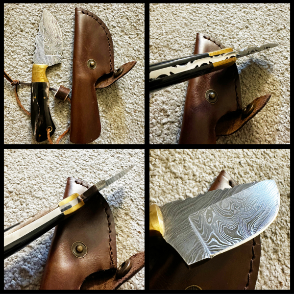 Schönes Handliches Jagdmesser mit Lederscheide und Damastklinge. 18cm Gesamtlänge Klinge 8,5cm 0,5 Klingenrücken.