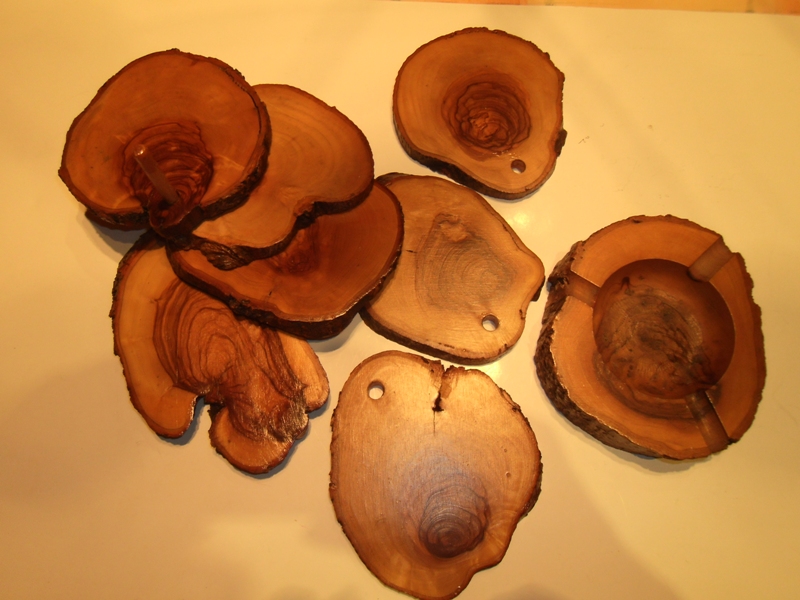 Aschenbecher und Halter, unten mit einem befestigten Flaschenuntersetzer und 6 Gläseruntersetzern, die abgenommen werden können. Die einzelnen Scheiben sind außen rundherum mit Baumrinde ummantelt. Auf den Stellflächen der Untersetzer sind die Jahresringe eines Baumes abgebildet und mit Klarlack überzogen.