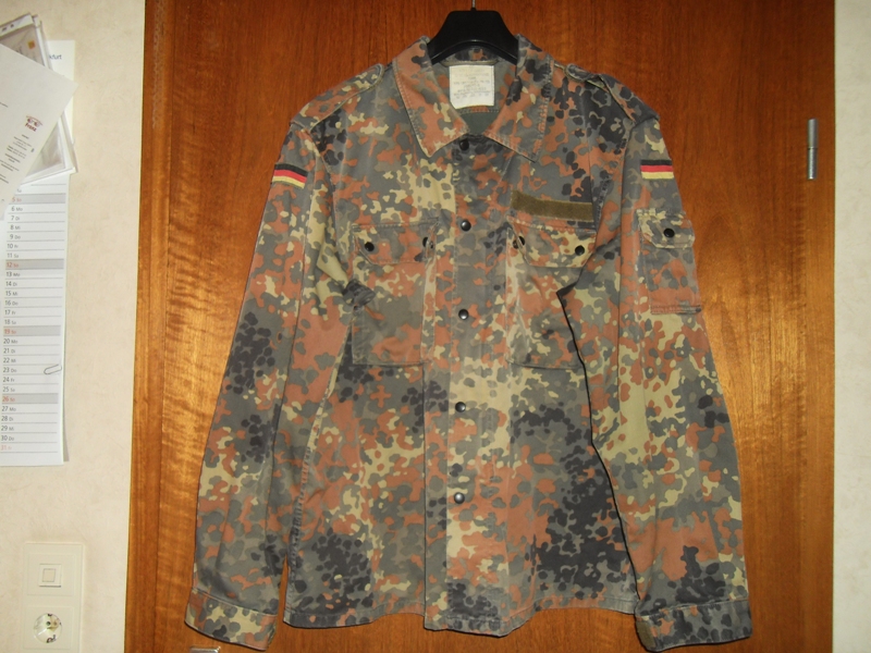 BW-Camoflash-Jacke: ½ Weite unter Armen 62 cm, Gesamtlänge 73 cm. Etikett beschriftet GE Köhlrt GmbH, Q/B21B/XO149/K0558, 1998, 175-185/110 (Gr.-N. 10) 7585/1015 8415-12-322-4223. 65 % Baumwolle/35 % Polyester, 40 Grad waschbar. Sehr guter Zustand.