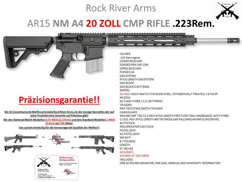 Biete ein AR15 im Kaliber .223Rem. Modell A4 CMP National Match des US amerikanischen TOP Herstellers Rock River Arms! Sie werden mit dieser Waffe jeden anderen Selbstlader in Punkto Präzision und Verarbeitung schlagen! Kein Oberland, Schmeisser, Windham, Hera!!! Die Waffe verfügt über einen 20-INCH Stainless Match Lauf , 1:8 , Lauf freischwingend, RRA TWO STAGE MATCH Abzug und 10 Schuss Magazin! Die Waffe wird im Rock River Koffer geliefert! Bitte vor dem Kauf Kontakt zu mir aufnehmen! Ein kostenloses Einlagern bis zur EWB ist kein Problem! Rock River Arms gehört zu den besten Waffenherstellen Weltweit und ist in den USA die Nummer 1 Sie werden keine bessere Waffen bekommen! Auch andere Modelle in verschiedenen Kalibern des Herstellers lieferbar! Lieferzeit und Preis bitte anfragen!!!!!! WWW.Waffen-Miller.de Rock River Arms ist einer der Weltweit besten Waffenhersteller, sollten Sie mit der Waffe nicht zufrieden sein, nehme ich sie wieder zurück(qualitativ oder Schussleistung) !Rock River Arms ist der einzige Hersteller der eine Präzisionsgarantie von einem 3/4 MOA auf 100m gibt. www.waffen-miller.de Wir führen auch Waffenexporte ins Europäische Ausland durch, fragen Sie an !! Caliber: .223Rem. LOWER RECEIVER:Forged RRA LAR-15M UPPER RECEIVER:Forged A4 GAS SYSTEM:Rifle Length Gas System GAS BLOCK:Gas Block Sight Base BARREL:20" Heavy Match Stainless Steel, Cryogenically Treated, 1:8 Twist MUZZLE:A2 Flash Hider / 1/2–28 Thread TRIGGER:RRA Two Stage Ultra Match Trigger HANDGUARD:RRA NM CMP TRO 12.5 Inch Rifle Length Free Float Rail Handguard, with Three 11.625 Inch Rifle Length NM TRO Modular Rails and an NM Sling Swivel BUTTSTOCK:RRA Operator CAR Stock PISTOL GRIP:A2 Pistol Grip WEIGHT:8.7 pounds LENGTH:37 Inches ACCURACY:3/4 MOA at 100 Yards INCLUDES: RRA Case, Manual and Warranty Information ,One 10 Round Magazine!