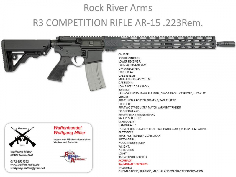 Biete ein AR15 im Kaliber .223Rem. Modell X-Series X-1 Rifle in Tan des US amerikanischen TOP Herstellers Rock River Arms! Sie werden mit dieser Waffe jeden anderen Selbstlader in Punkto Präzision und Verarbeitung schlagen! Kein Oberland, Schmeisser, Windham, Hera!!! Die Waffe verfügt über einen 18 Zoll gefluteten Stainless Match Lauf , 1:8 , Lauf freischwingend, RRA TWO STAGE MATCH Abzug und 10 Schuss Magazin! Die Waffe wird im Rock River Koffer geliefert! Bitte vor dem Kauf Kontakt zu mir aufnehmen! Ein kostenloses Einlagern bis zur EWB ist kein Problem! Rock River Arms gehört zu den besten Waffenherstellen Weltweit und ist in den USA die Nummer 1 Sie werden keine bessere Waffen bekommen! Auch andere Modelle in verschiedenen Kalibern des Herstellers lieferbar! Lieferzeit und Preis bitte anfragen!!!!!! WWW.Waffen-Miller.de Rock River Arms ist einer der Weltweit besten Waffenhersteller, sollten Sie mit der Waffe nicht zufrieden sein, nehme ich sie wieder zurück(qualitativ oder Schussleistung) !Rock River Arms ist der einzige Hersteller der eine Präzisionsgarantie von einem 3/4 MOA auf 100m gibt. www.waffen-miller.de Wir führen auch Waffenexporte ins Europäische Ausland durch, fragen Sie an !! Kaliber .223Rem. LOWER RECEIVER:Forged RRA LAR-15M