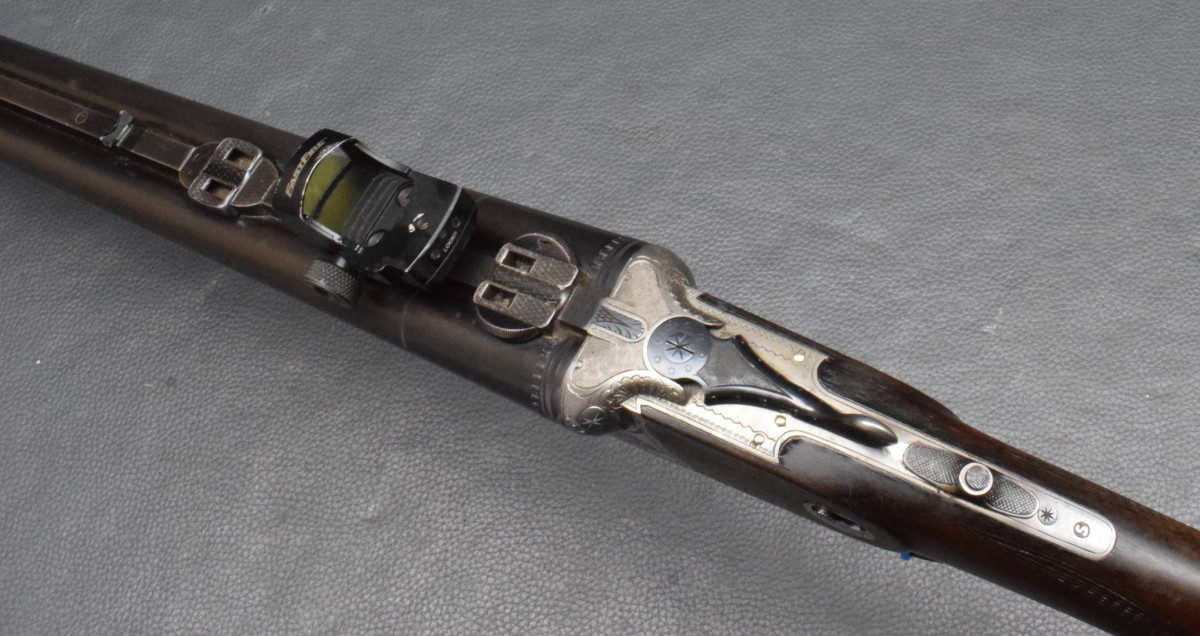 montiert mit Zielfernrohr Nikko Supra 6x43 L53 E/D/S Abs. 1, mittels SEM Montage und Burris Fast Fire Leuchtpunktvisier, mittes Aufkippmontage auf einer 14mm Schiene,