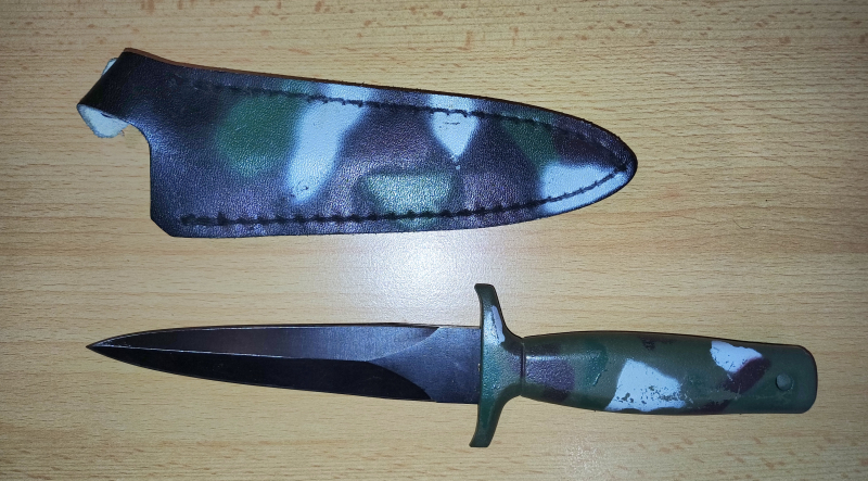 Verkauft wird ein Sammlerdolch aus den 1980er Jahren. C-JUL HERBERTS Kampf- und Überlebensmesser, Rostfrrei. Feststehende Klinge. Camouflage-Design. Wird mit Originalscheide geliefert. Klingenlänge 12,00 cm. Griff 10 cm.++++++++++ Mit Abgabe eines Gebots bzw. mit dem Kauf bestätigt der Käufer, dass er mindestens 18 Jahre alt ist und den Erwerb sowie Besitz des angebotenen Messers nach den für ihn geltenden gesetzlichen Bestimmungen rechtmäßig vornehmen darf. Der Verkäufer übernimmt keine Haftung für einen Verstoß des Käufers gegen geltende Gesetze oder Vorschriften.++++++++++