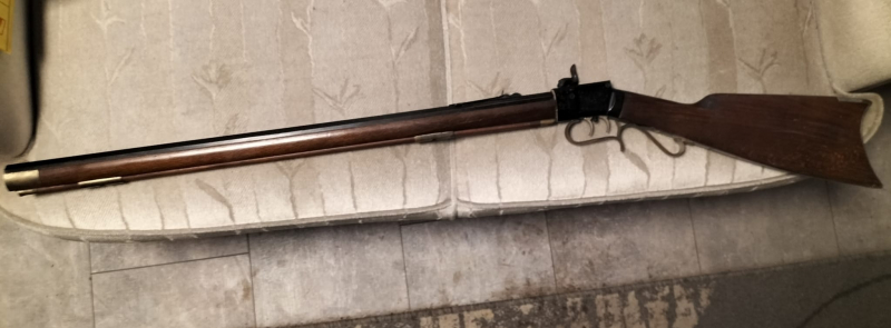 sog. Forster-Rifle (so wurden diese Gewehre in der Vergangenheit oft genannt), blanker Lauf, Stecher i.O., die Brünierung an einigen Stellen etwas rau, Beschriftung: linke Laufseite Black Powder only, Replica Arms Inc., rechte Laufseite Made in Italy, PR, niedrige vierstellige Seriennummer, cal. 45, Beschußzeichen XX8 (laut Internet aus 1972), PN (Schwarzpulverbeschuß) und HEGE. Holz mit leichten Gebrauchsspuren, die Schaftkappe oben einen Spalt zum Schaftholz, die Messingteile angelaufen/Patina. Verkauf im Auftrag aus Nachlaß. Abholung erwünscht.