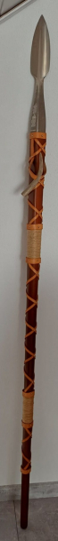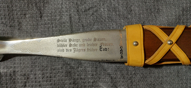 Die Feder ist aus den 80er Jahren. Blattförmige Stahlklinge, Tülle mit geätzten Jagdmotiven, Eichenlaubdekor und Spruch: "Steile Hänge, grobe Sauen, kühler Sekt und leichte Frauen, sind des Jägers früher Tod!" Sie ist mit Lederriemen umwickelt, die an den Holzschaft genietet sind.