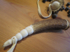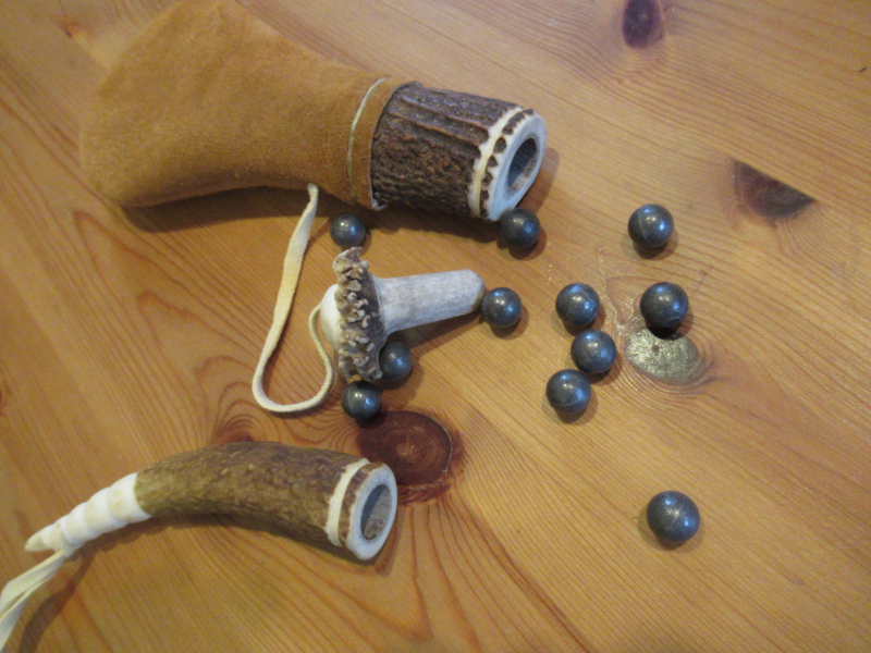 Kugelbeutel aus Leder, handgenäht, Tülle und Stopfen aus Hirschhorn gefertigt, Länge 20,5 cm, für Rundkugeln bis incl. cal.54, + superschönes olstyle Pulvermaß aus Hirschhorn, verschnitten, Länge 12 cm, ca. 50 grn. Replikate des 18. Jahrhunderts