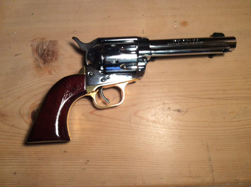 Die dunklen Holzgriffschalen kontrastieren sehr schön zum Chromfinish