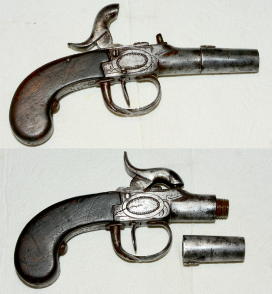Original Perkussionsterzerol um 1850/60, wahrscheinlich Frankreich, abschraubbarer Lauf, Lauflänge 3,8 cm, Gesamtlänge 16 cm, keine Herstellerangabe und kein Beschuss, Rostflecken und ein Riss in der rechten Schlossseite, der aber wahrscheinlich produktionsbedingt ist, technisch ok