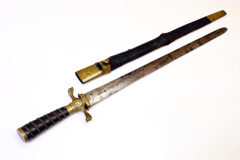 Lederne Scheide mit Messingbeschlägen. Im Dekor en suite. Die Scheide mit Altersspuren. Das Scheidenleder partiell gerissen, beschädigt. Es fehlt das Beimesser. Das Mundblech gepunzt "5".