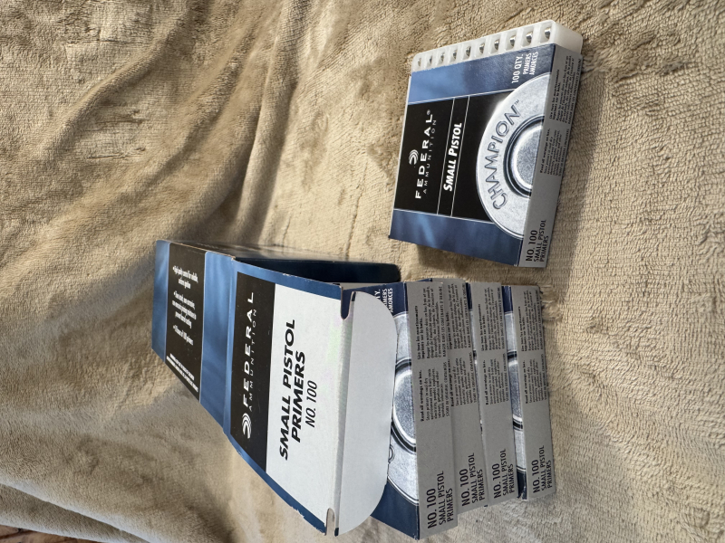 Verkaufe von mir vor ca. 4 Jahren neu gekaufte und seither nur trocken gelagerte Zündhütchen Federal Small Pistol Primers No. 100 in Originalverpackung mit 10 Einzelpackungen a 100 Stück, insgesamt somit 1.000 Stück. Die Federal Zündhütchen sind besonders weich und qualitativ sehr gut.
