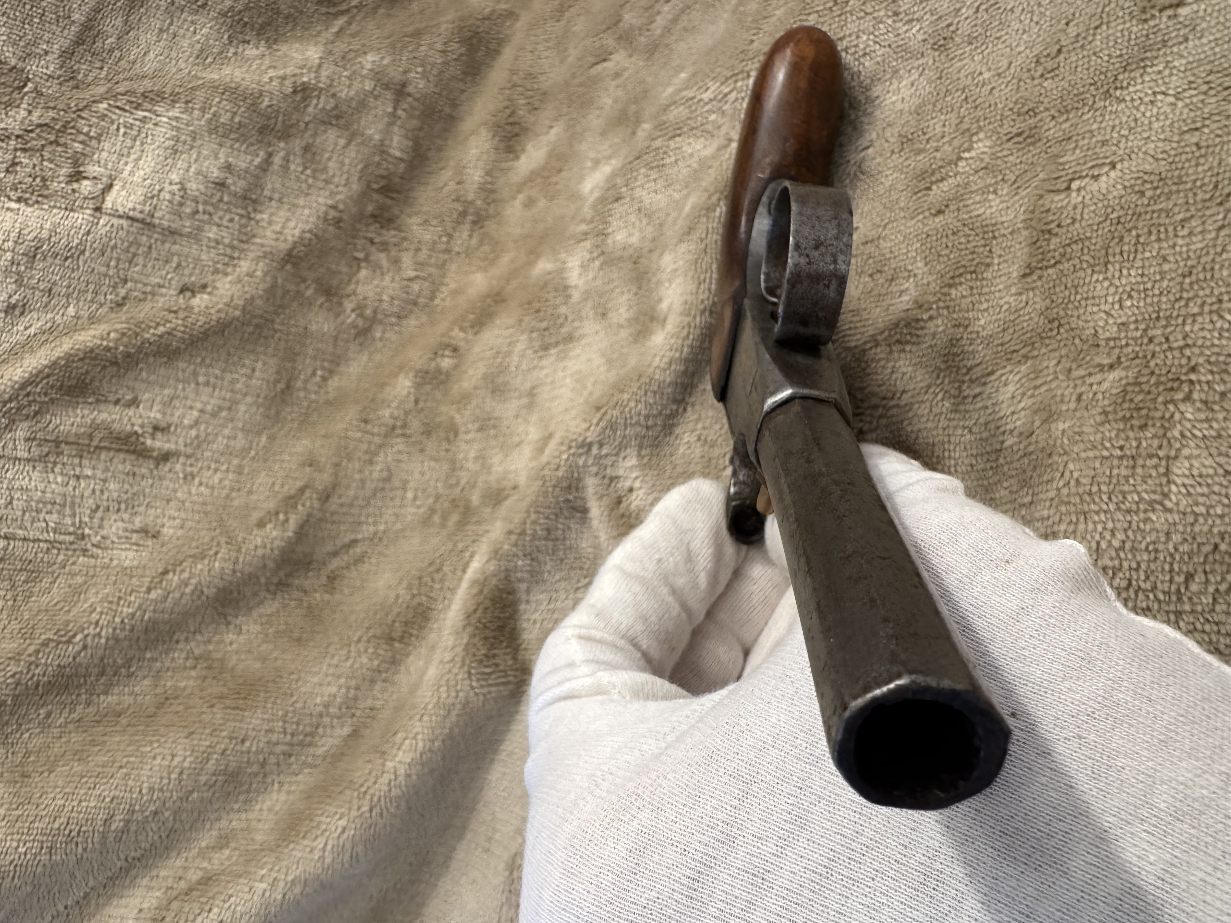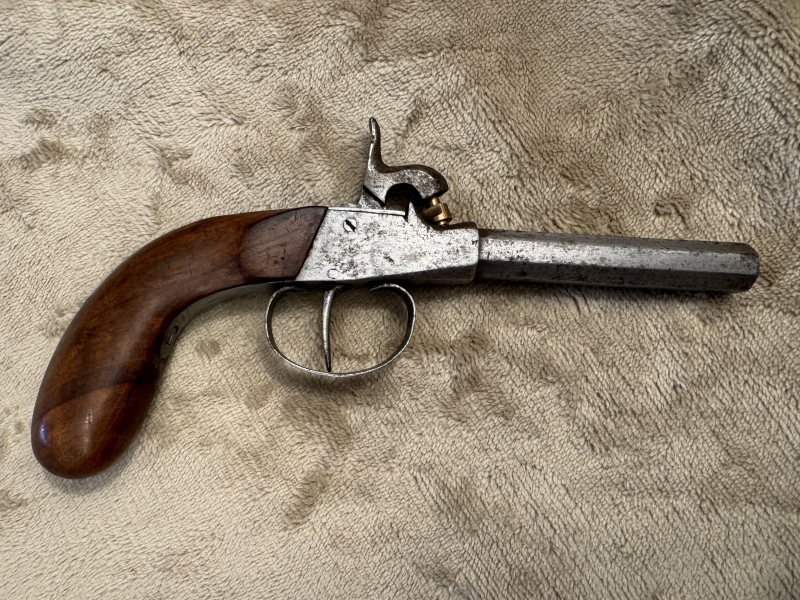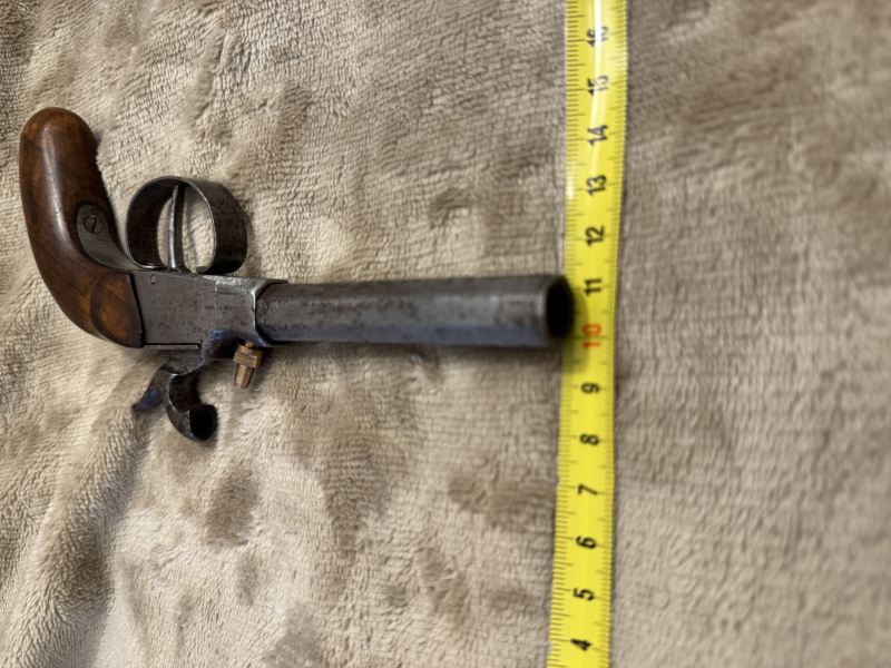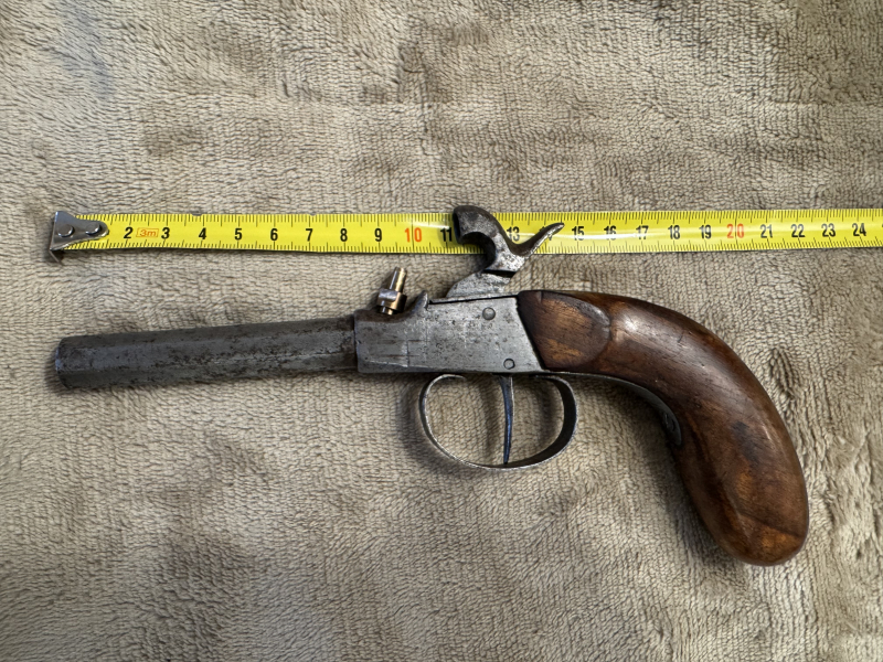 Verkaufe ein vermutlich sehr alte sog. "Weinbergpistole" bzw. "Vogelschreckpistole", Schloss funktioniert einwandfrei, neues Piston, Kaliber unbekannt, Lauf innen nicht besonderes gut, nicht gezogen, keine weiteren Beschuss-, Hersteller- oder Kaliberstempel, nur "69" (siehe Fotos).
