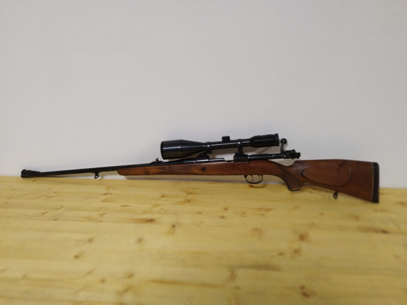 1 Stück Repetierbüchse Mauser Modell 98, gefertigt von Kettner im Hochwildkaliber 8 x 68S. ZFR Kahles Helia 8 x 56 S., Abs: 1 montiert mit EAW Schwenkmontage, 26er Ringe, Rückstoßstollen im Schaft, Stecher Gummikappe. LL 65 cm, Schaft 37 cm, Gesamtlänge 117 cm. Gebrauchtwaffe in sehr gutem Zustand. Mit einer der leistungsstärksten 8mm Patronen.