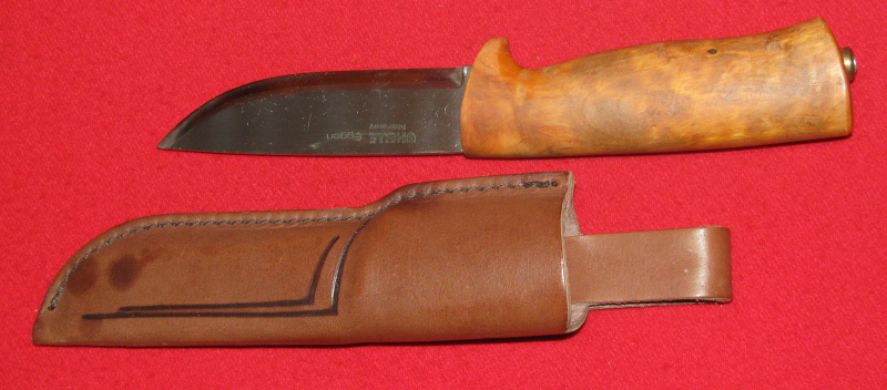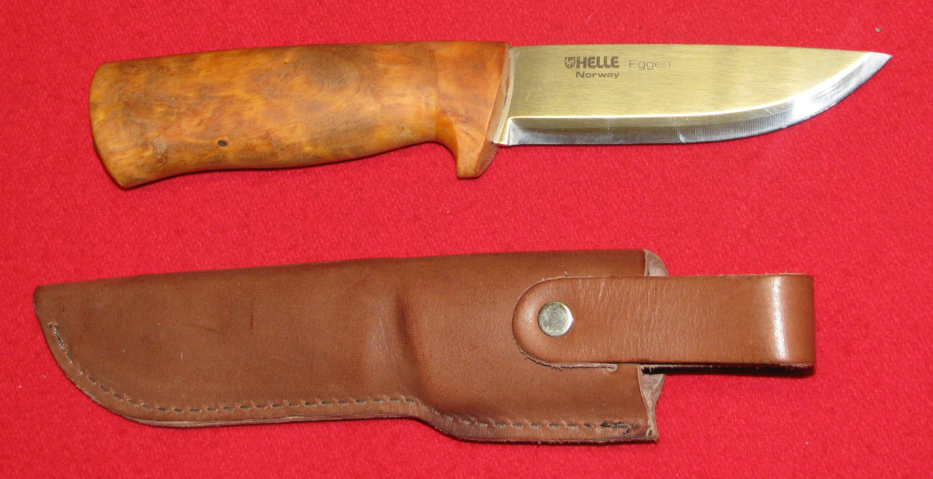 Zum Verkauf kommt ein Jagdmesser von HELLE Eggen Norway mit Lederscheide