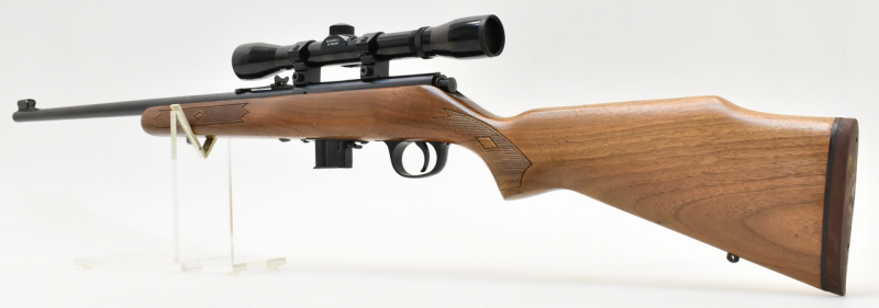 Amerikanisches KK-Gewehr mit einem 7-Schuss Einsteckmagazin, seitlicher Sicherung und einem Bushnell ZF Banner 4x Duplex Absehen. 35,5cm langer Schaft ( gemessen Abzug bis Mitte Schaftkappe.) Erstbeschuss von 1992.