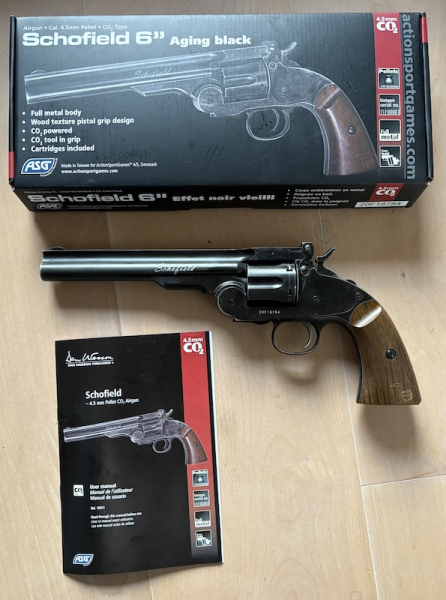 Verkaufe einen gebrauchten Schofield-Revolver (CO2!) im Kaliber .177 (4,5mm Diabolo) mit der original Verpackung, Anleitung auf deutsch und 6 Patronenhülsen