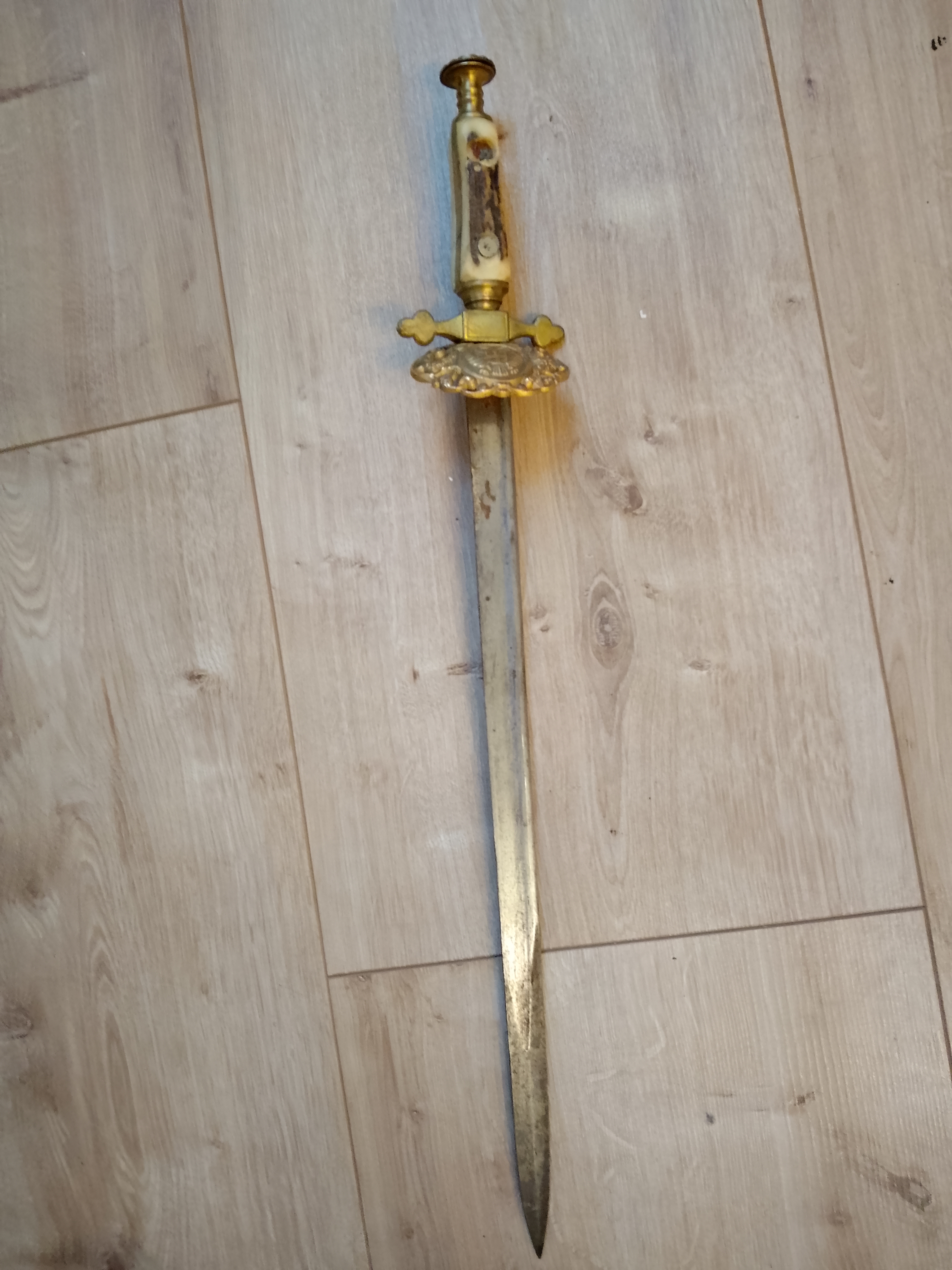 Deko Dolch aus verschiedenen Blankwaffen Solinger Ersatzteilen hing so in einer Solinger Kellerbar, Klinge offensichtlich Steckrückenklinge der Marine, gekürzt Parierstange vom deutschen Feuerwehrdolch drittes Reich, Stichblatt mir so unbekannt, sicherlich auch älterer Fertigung echte Hirschhornschalen zum fairen Startpreis ab einem Euro