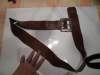 Ledergürtel mit goldfarbener Zierschnalle in mittelbraun. Breite 6 cm, Gesamtlänge 1,23 m,, Lochung bei 96 cm bis 1,20 m. Der Gürtel kam bei einem Theaterstück "Das Blutbad von Södel" im Jahr 2002 zum Einsatz. Leider ist er durch diesen Einsatz von cm 15 bis cm 35 sehr mitgenommen und an einer Stelle eingerissen. Die unteren 85 cm und die oberen 15 cm sind in Ordnung.