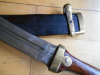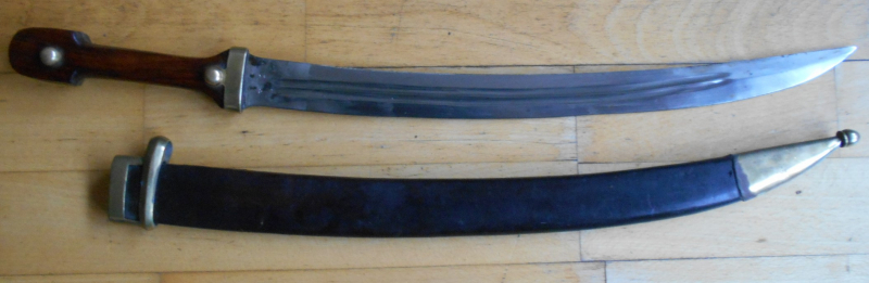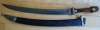 großes Messer mit Scheide Sowjet? Länge ca. 66cm mit Holzgriff dieser mit Messingnieten, Holzscheide mit Leder überzogen und Messingbeschlägen, Klinge mit diversen Markierungen, Klinge gebogen ca. 43 cm, Klinge z.T. Fleckig Messing etwas angelaufen,