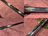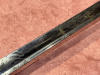 Gerade, beidseitige gekehlte, einschneidige Klinge, in der oberen Hälfte ehemals gebläut und gold-tauschiert, leider hat der Zahn der Zeit zugeschlagen, Rostnarben vorhanden, dafür keine Scharten.