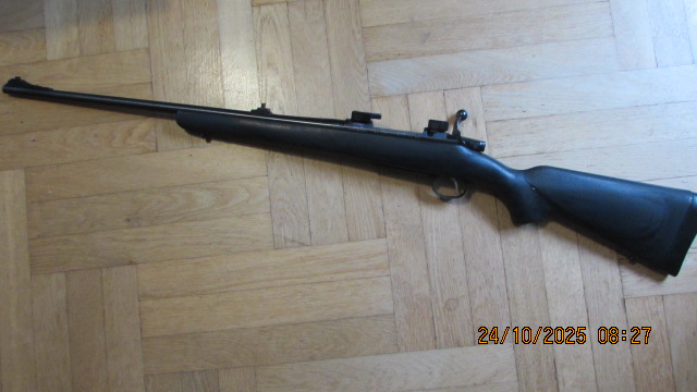 Deutsche Backe, fr. Stecher, Kimme und Korn, 5-Schuss Klappdeckel Magazin, Schiebesicherung, Systemhülsen mit Prismenschienen, gültiger Beschuss ist vorhanden.
