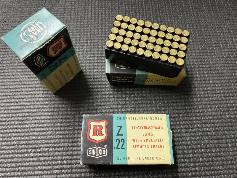 Sie bieten auf drei Päckchen a 50 Schuss (insgesamt 150 Schuss) RWS Patronen im Kaliber .22; Bleiköpfe; schwach geladen!