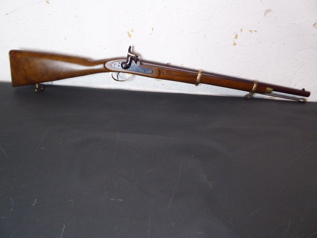 Aus meiner Sammlung gebe ich, ein älteren Nachbau eines Südstaaten Kavallerie Karabiner COOK&BROTHER N.O.1861 PEDERSOLI Italien ab. Eine älter Fertigung, die in dieser Qualität nicht mehr so schnell zu bekommen ist, es ist nicht mehr aus Italien zu bekommen, ein absolutes Präzision Gewehr. So wie es aussieht wurde das Teil auch nicht Benutzt, sondern nur als Sammelstück hingelegt. Schäftung aus Amerikanischem Nussbaum mit Messingbeschläge ohne Risse oder Durchbrüche. Schloss und Schlossplatte Bunt Gehärtet mit Modellbezeichnung und Jahreszahl. Das Teil ist voll funktionstüchtig, lässt sich auf zwei Stellungen spannen und sauber abschlagen. Lauf noch original Gebräunt mit sehr starken Zügen, mit Hersteller und Beschussmarken und originalem Ladestock. Das Teil ist im sehr Guten Sammelwürdigen und zu Gebrauchenden Zustand. Alles andere entnehmen Sie Bitte den Fotos. Gesamtlänge: 102 cm, Lauflänge: 61 cm, Kaliber: 58 . Kann zu jederzeit bei mir besichtigt werden. Privatauktion keine Rücknahme und Garantie.