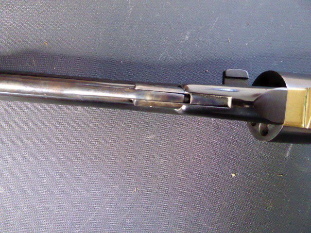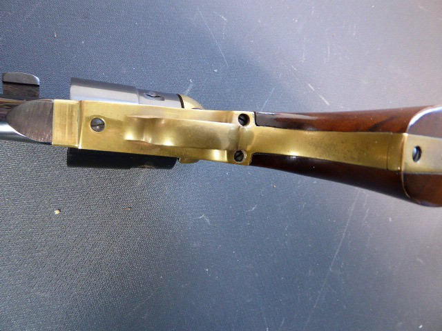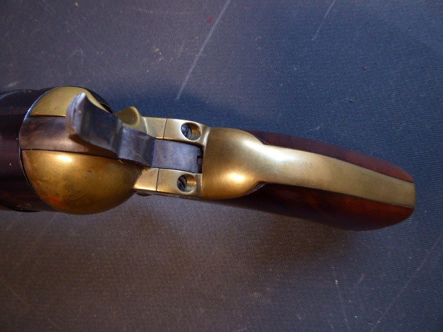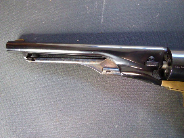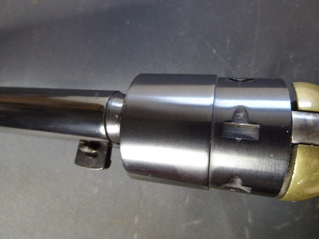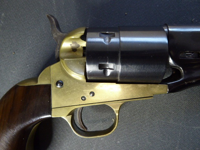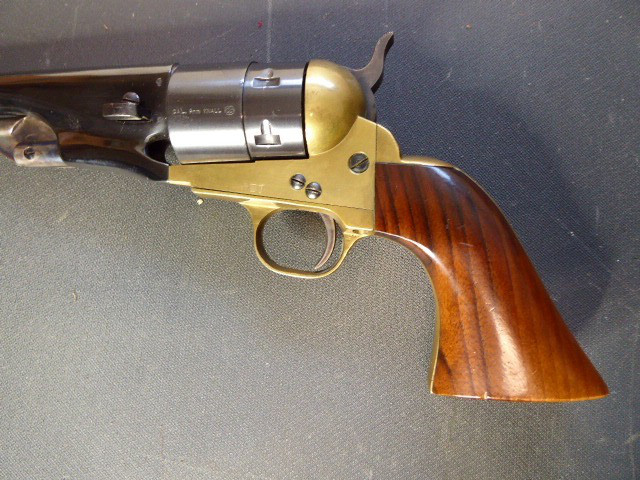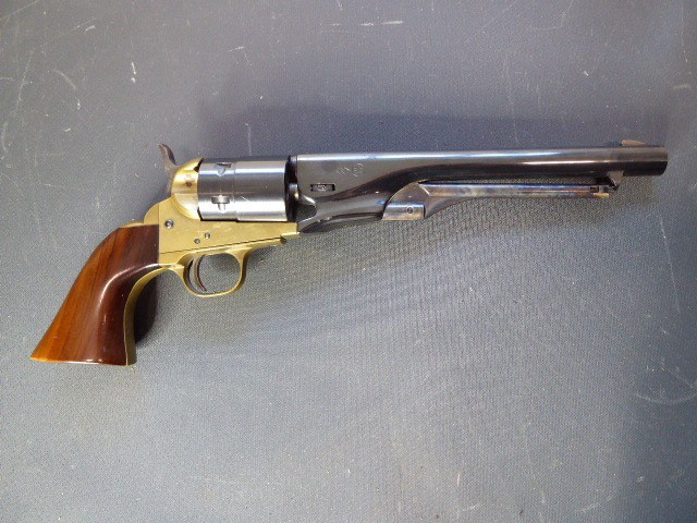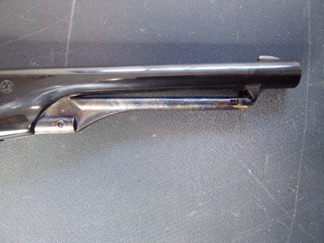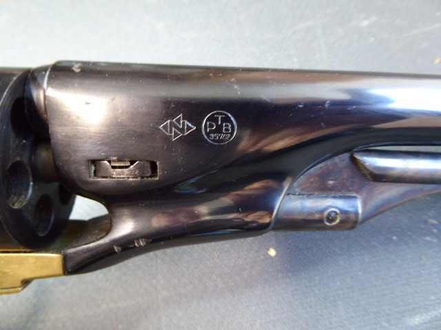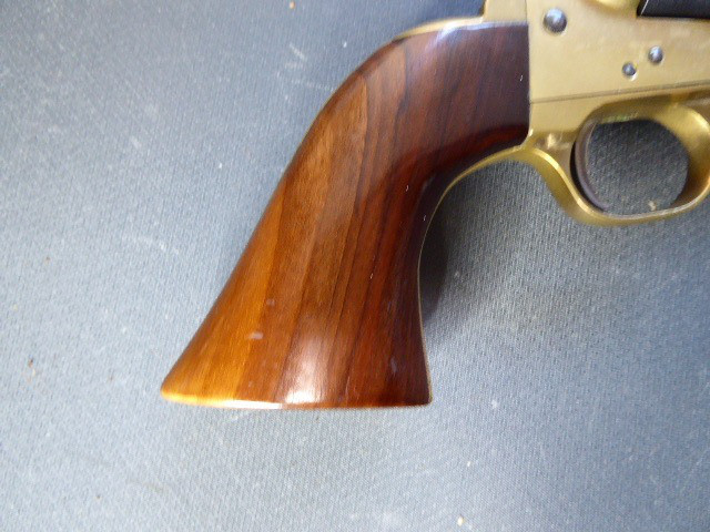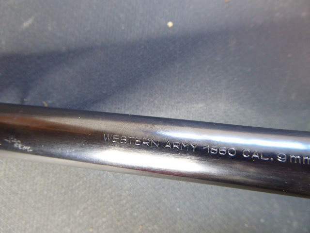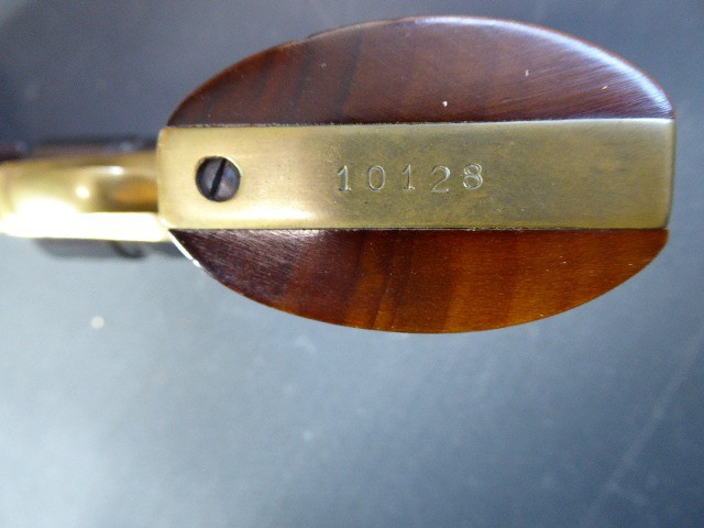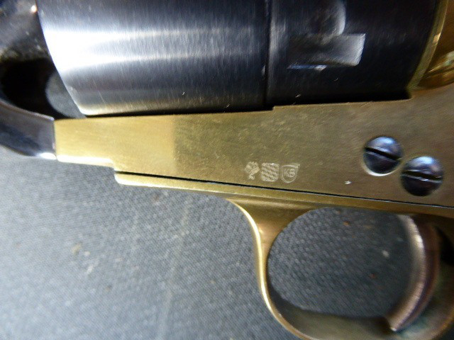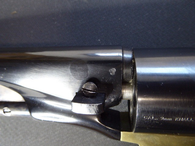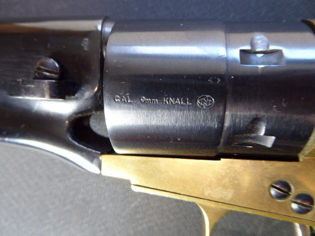 Aus meiner Sammlung gebe ich, einen älteren Western Army Revolver Mod.1860 Kal. 9 mm Knall PTB 357/2 Hersteller PEDERSOLI Ital. ab. Vertreiber war NEUMANN, Griff zwei ausgesuchte Holzschalen. Offener Rahmen aus Messing, der Rest in Ganzstahl Ausführung, alles noch original Brüniert. Trommel für 6 Schuss. Lauf, im Lauf ein beweglicher Stahldraht. unterm Lauf noch der Originale Ladehebel in Bunt Gehärtet. Der Revolver ist voll Funktionstüchtig. im sehr Guten Sammelwürdigen und zu gebrauchenden Zustand. Alles andere entnehmen Sie Bitte den Fotos. Kann zu jederzeit bei mir besichtigt werden. Privatauktion keine Rücknahme und Garantie.