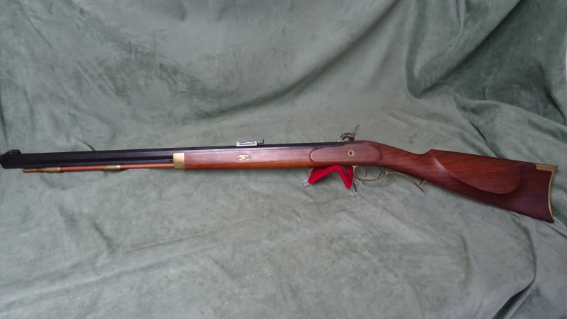 Neuwertiges Perkussionsgewehr von Investarms, Made in Italy,Kaliber .45BP. Die Waffe ist ungeschossen, es sind leider einige kleine Druckstellen im Holz. Stecherabzug, fein einstellbar. 8 Kant Lauf , tief schwarz brüniert. Mit einstellbarer Visierung. Perkussionszündung, Schloß ist bunt gehärtet, komplett mit Ladestock, ist leider etwas beschädigt. Patchbox, Abzugsbügel und Schaftkappe in Messing. Schaft mit deutscher Backe, schön dunkel gemasert. Der Lauf läßt sich zum reinigen aushängen. Lauflänge ca. 73cm, gesamt ca. 114cm.