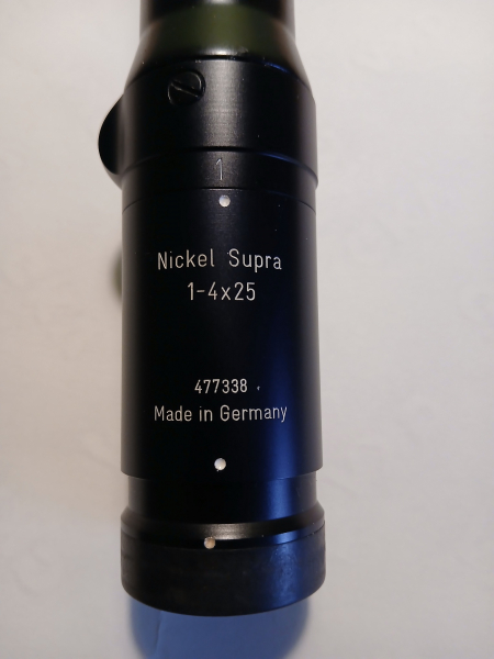 Verk. aus Jägernachlass gebrauchtes aber absolut neuwertiges Drückjagd ZF Nickel Supra 1-4x25 ohne Lp mit Drückjagdabsehen. Das Glas hat die 70° Trapez Außenschiene. Montiert ist eine orig. Blaser Sattelmontage für R93 etc. Das Glas ist in einem neuwertigen Zustand. Im hinteren Teil der Montageschiene wurde der Lack etwas ausgebessert. Klare Durchsicht und Randschärfe, keine Kratzer und Putzschlieren auf den Linsen. Alle Verstellungen i.O. Das Glas war wohl nie im Einsatz. Dazu gehören noch die Staubschutzdeckel.