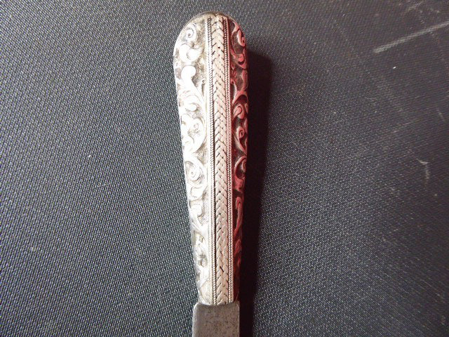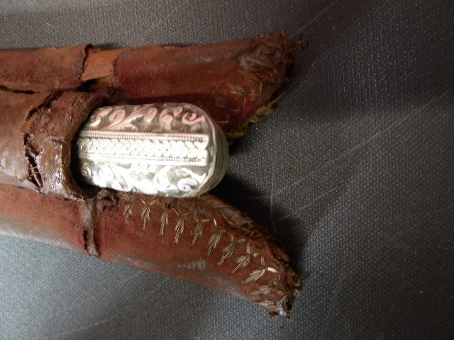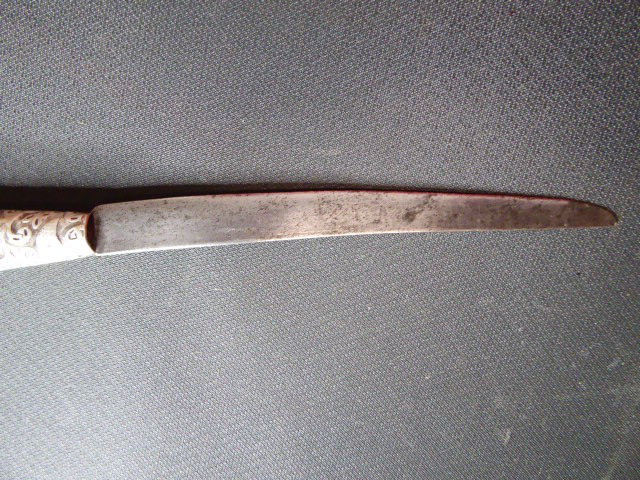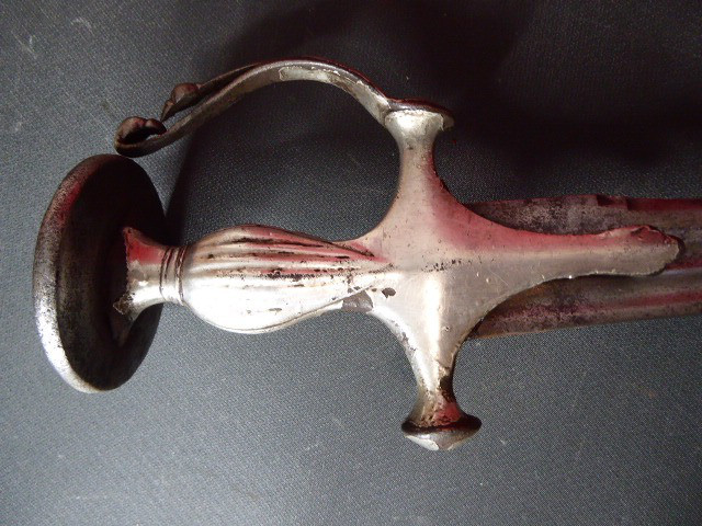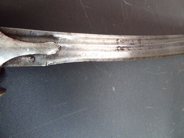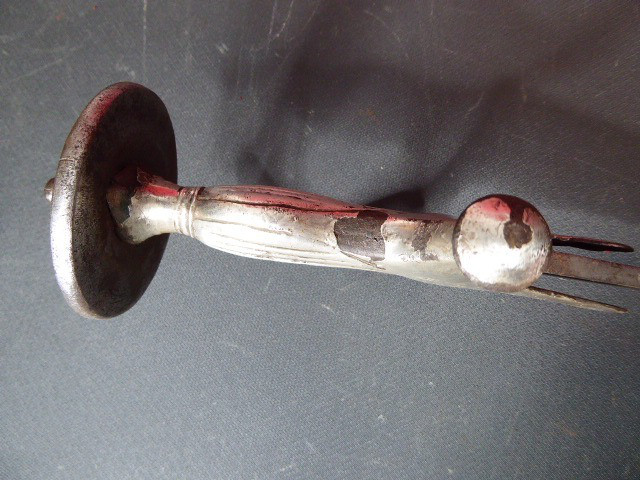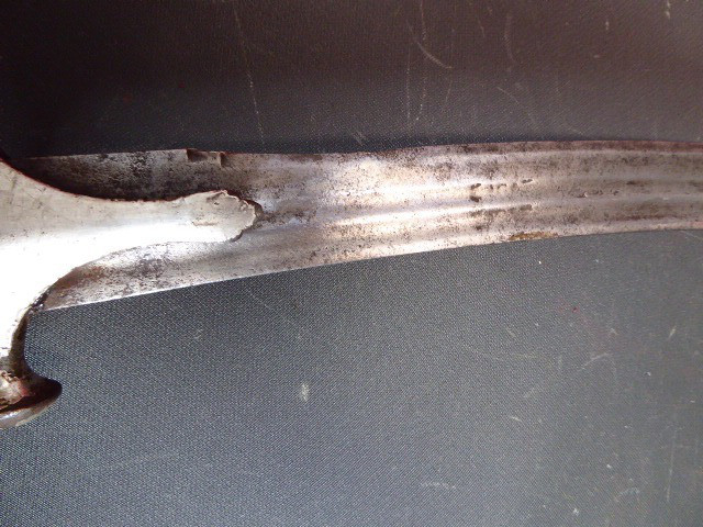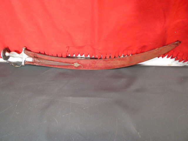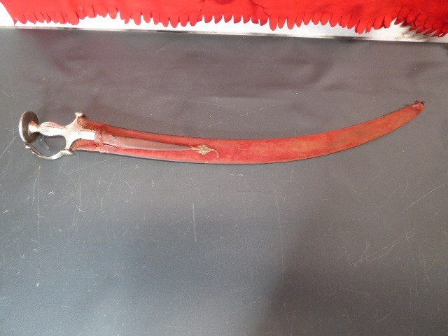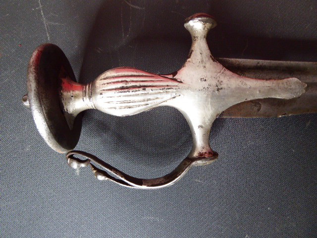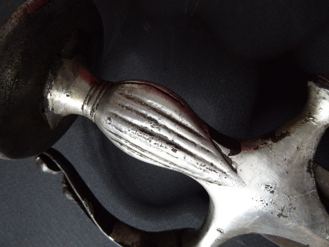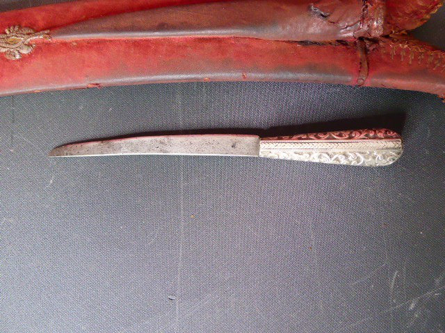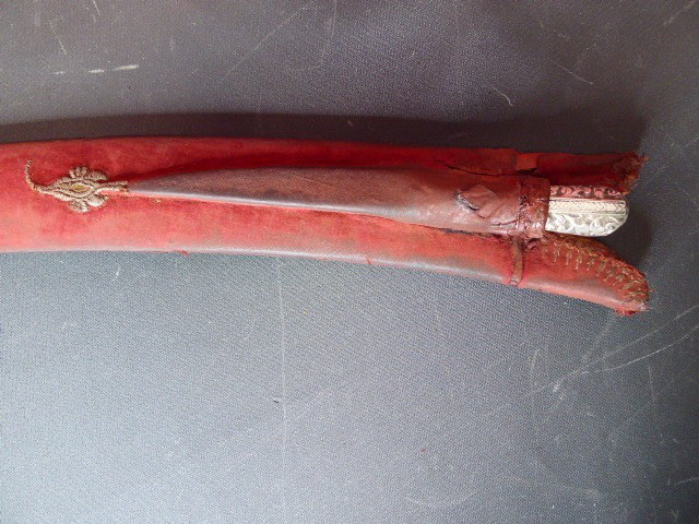 Aus meiner Sammlung gebe ich, ein alten Seltenen Indischen Talwar Gefäß dick Versilbert mit Scheide und Beimesser mit Silbergriff ab. Gefäß Eisen, ca. noch zu 80% mit sehr dick Silber ummantelt. Scheide Holz mit rotem Samt ummantelt, der Samt Teilweise schon etwas zerschlissen mit Intrigierter Beimesse Scheide, darunter Silber Stickerei. Das Originale Beimesser mit Silbergriff. Hochwertige Einschneidige Klinge, mit Meistermarke, beidseitig zwei schmale Kehlungen und Inschriften, Klinge vorne noch mal breiter werdend. Das Teil ist aus der Zeit im Guten Sammelwürdigen Zustand. Alles andere entnehmen Sie Bitte den Fotos. Gesamtlänge: 88 cm, ohne Scheide: 84 cm, Klingenlänge: 73 cm, Klingenbreite: 3,8 cm. Beimesser Gesamtlänge: 21 cm, Klingenlänge: 13,2 cm, Klingenbreite: 1,3 cm. Kann zu jederzeit bei mir besichtigt werden. Privatauktion keine Rücknahme und Garantie.