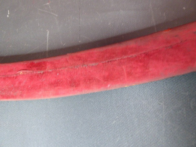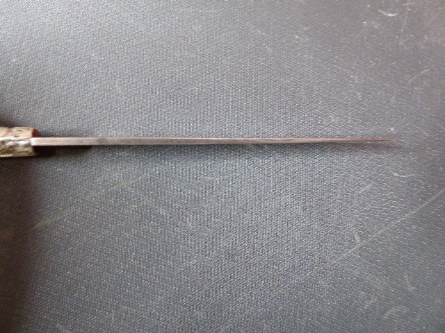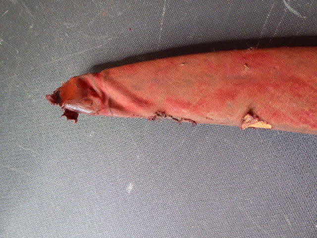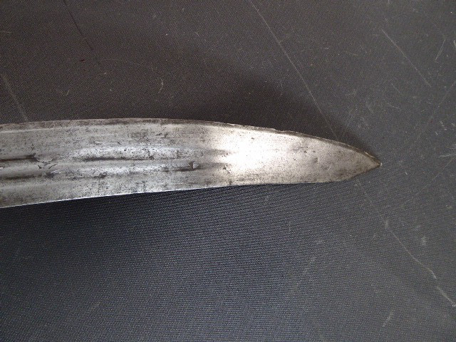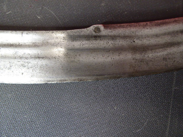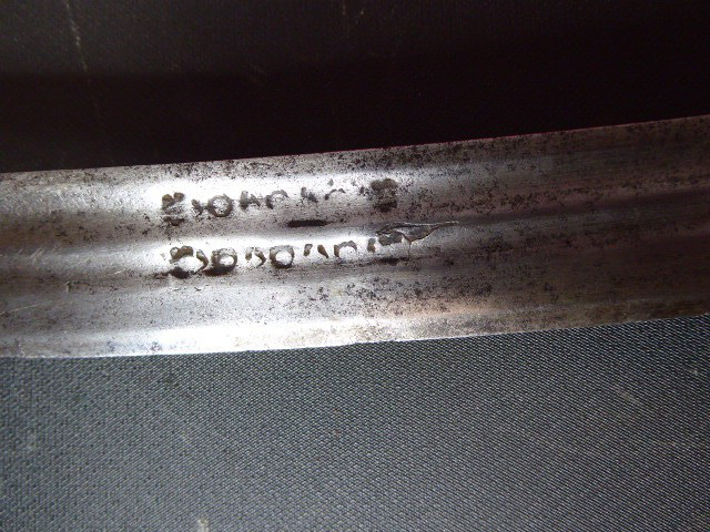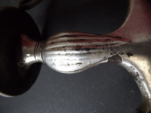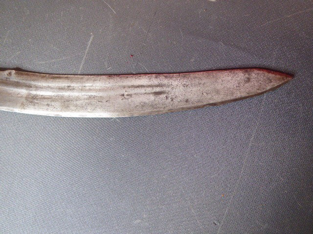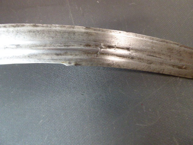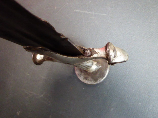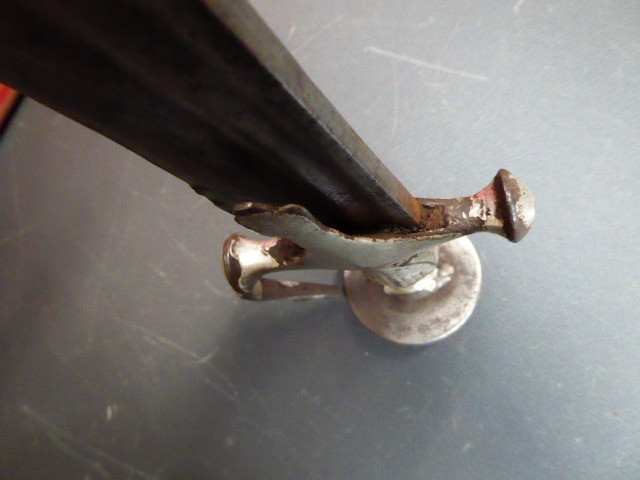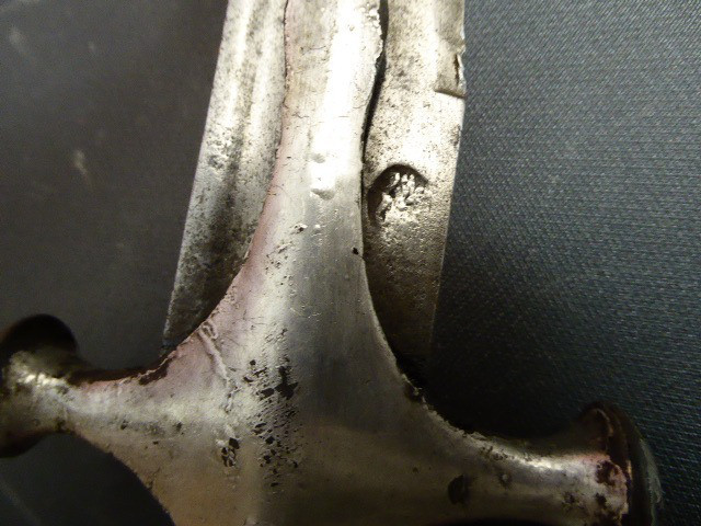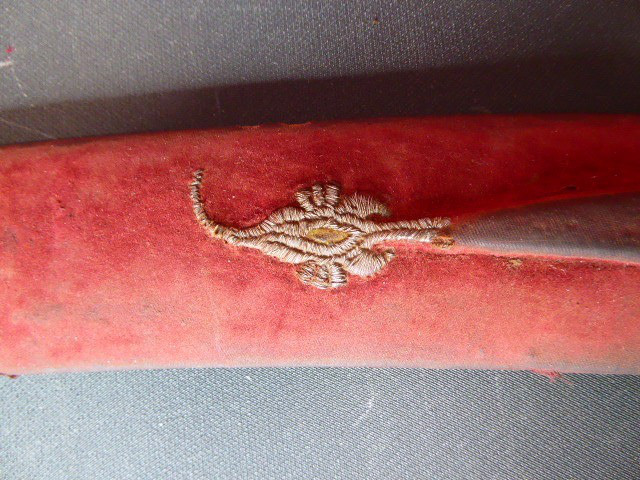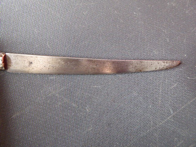 Aus meiner Sammlung gebe ich, ein alten Seltenen Indischen Talwar Gefäß dick Versilbert mit Scheide und Beimesser mit Silbergriff ab. Gefäß Eisen, ca. noch zu 80% mit sehr dick Silber ummantelt. Scheide Holz mit rotem Samt ummantelt, der Samt Teilweise schon etwas zerschlissen mit Intrigierter Beimesse Scheide, darunter Silber Stickerei. Das Originale Beimesser mit Silbergriff. Hochwertige Einschneidige Klinge, mit Meistermarke, beidseitig zwei schmale Kehlungen und Inschriften, Klinge vorne noch mal breiter werdend. Das Teil ist aus der Zeit im Guten Sammelwürdigen Zustand. Alles andere entnehmen Sie Bitte den Fotos. Gesamtlänge: 88 cm, ohne Scheide: 84 cm, Klingenlänge: 73 cm, Klingenbreite: 3,8 cm. Beimesser Gesamtlänge: 21 cm, Klingenlänge: 13,2 cm, Klingenbreite: 1,3 cm. Kann zu jederzeit bei mir besichtigt werden. Privatauktion keine Rücknahme und Garantie.