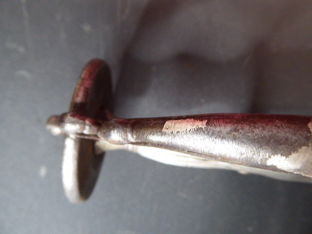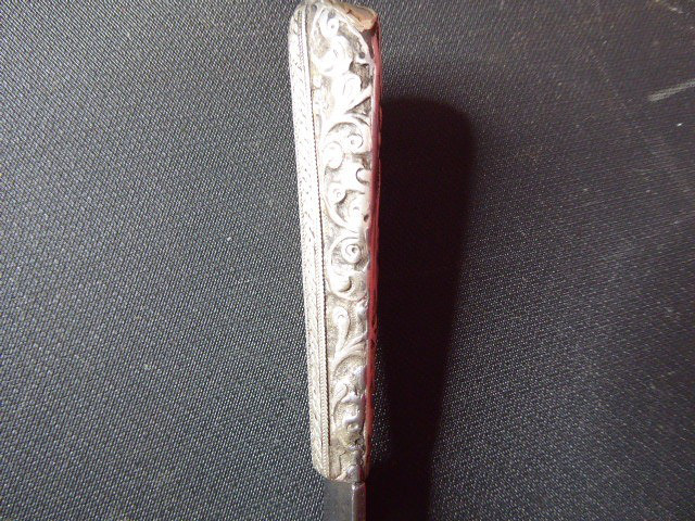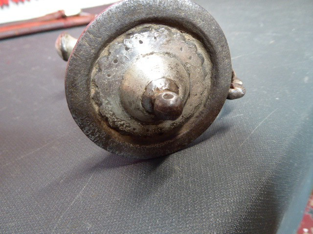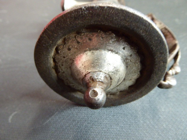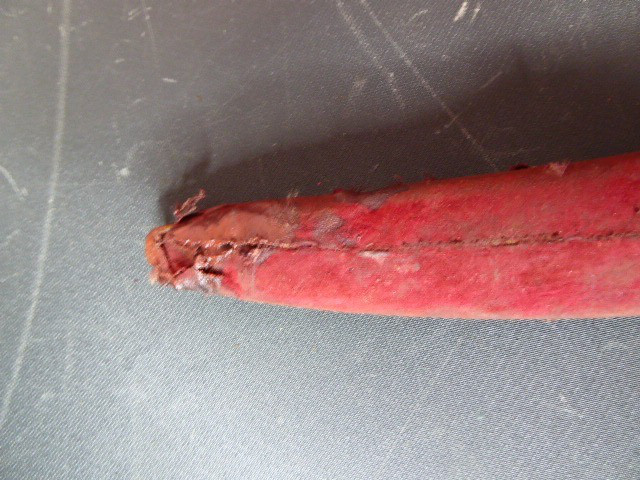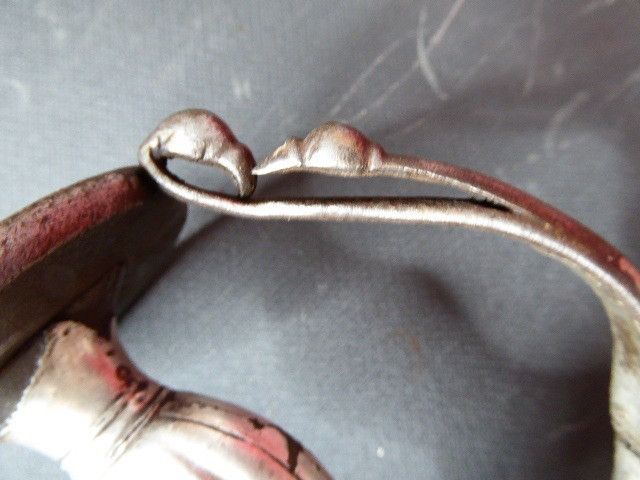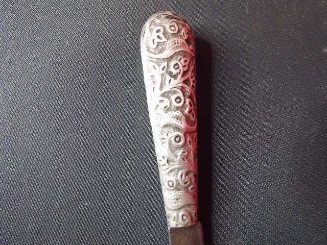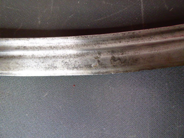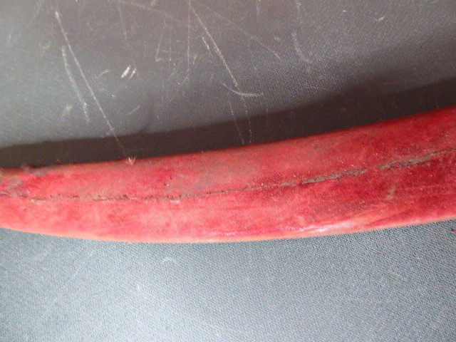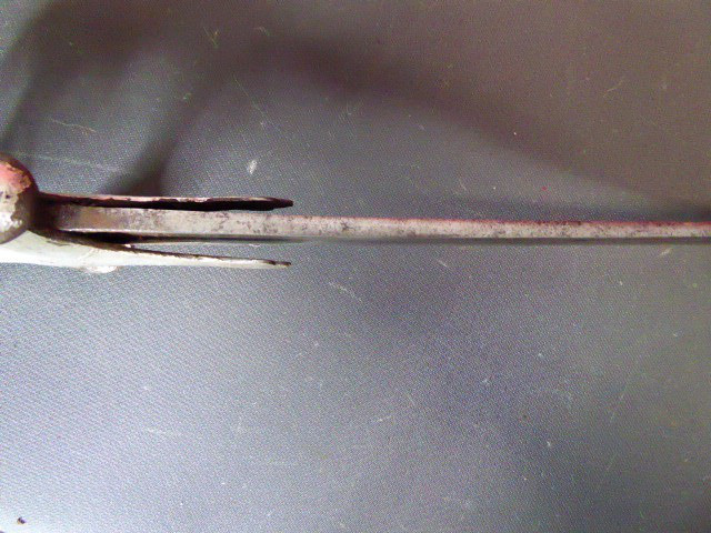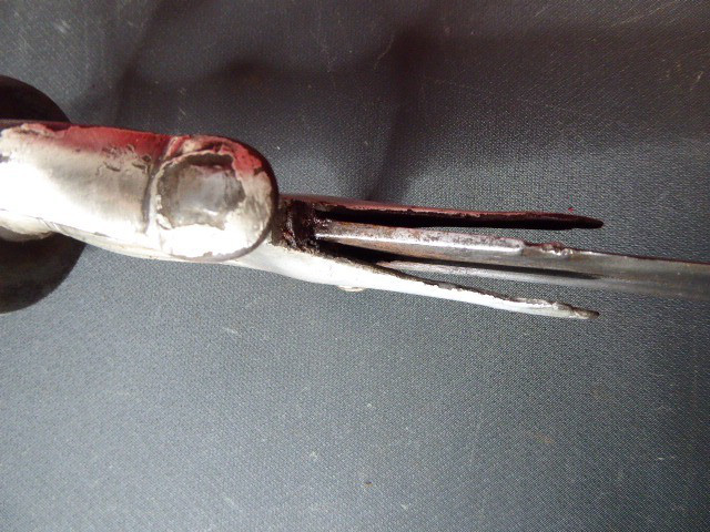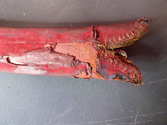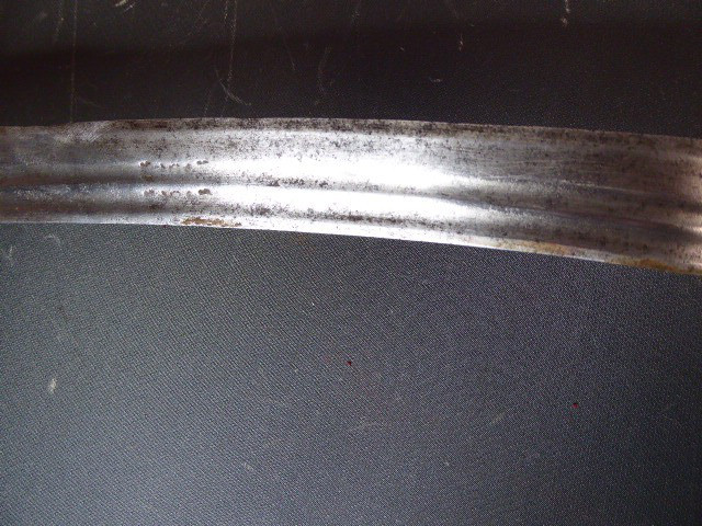 Aus meiner Sammlung gebe ich, ein alten Seltenen Indischen Talwar Gefäß dick Versilbert mit Scheide und Beimesser mit Silbergriff ab. Gefäß Eisen, ca. noch zu 80% mit sehr dick Silber ummantelt. Scheide Holz mit rotem Samt ummantelt, der Samt Teilweise schon etwas zerschlissen mit Intrigierter Beimesse Scheide, darunter Silber Stickerei. Das Originale Beimesser mit Silbergriff. Hochwertige Einschneidige Klinge, mit Meistermarke, beidseitig zwei schmale Kehlungen und Inschriften, Klinge vorne noch mal breiter werdend. Das Teil ist aus der Zeit im Guten Sammelwürdigen Zustand. Alles andere entnehmen Sie Bitte den Fotos. Gesamtlänge: 88 cm, ohne Scheide: 84 cm, Klingenlänge: 73 cm, Klingenbreite: 3,8 cm. Beimesser Gesamtlänge: 21 cm, Klingenlänge: 13,2 cm, Klingenbreite: 1,3 cm. Kann zu jederzeit bei mir besichtigt werden. Privatauktion keine Rücknahme und Garantie.