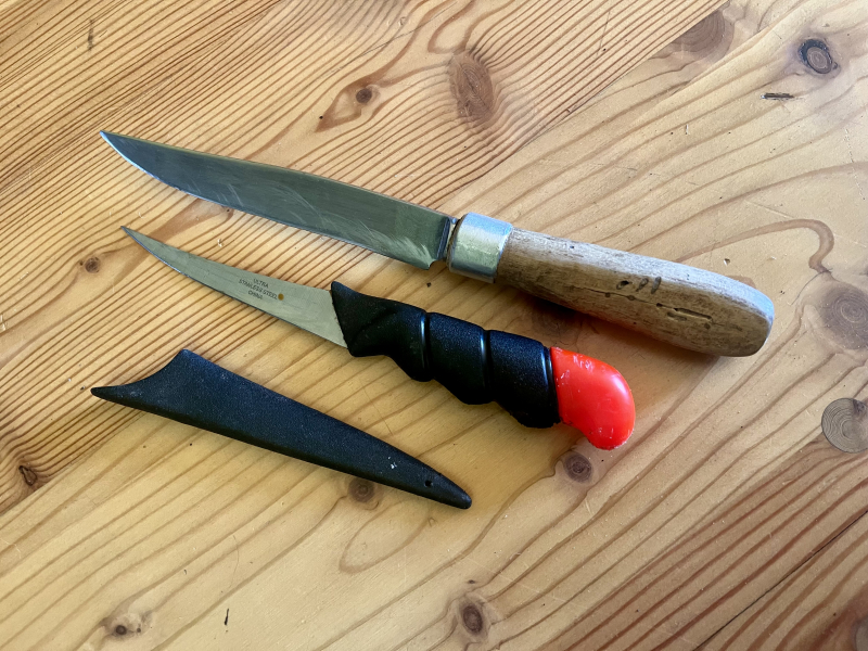 Zwei Fischmesser, eines mit Kunststoffscheide..