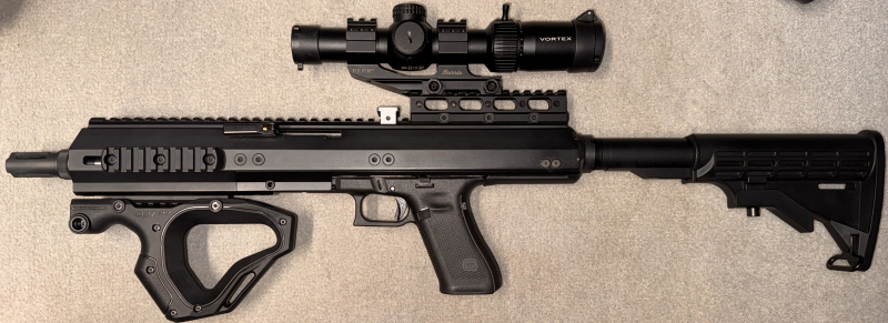 Montiert war es auf dem Griffstück einer Glock 17 (Gen 5). Das Wechselsystem selbst ist jedoch im Kaliber 9mm und verfügt über einen 10 Zoll Polygonlauf mit Gewinde.