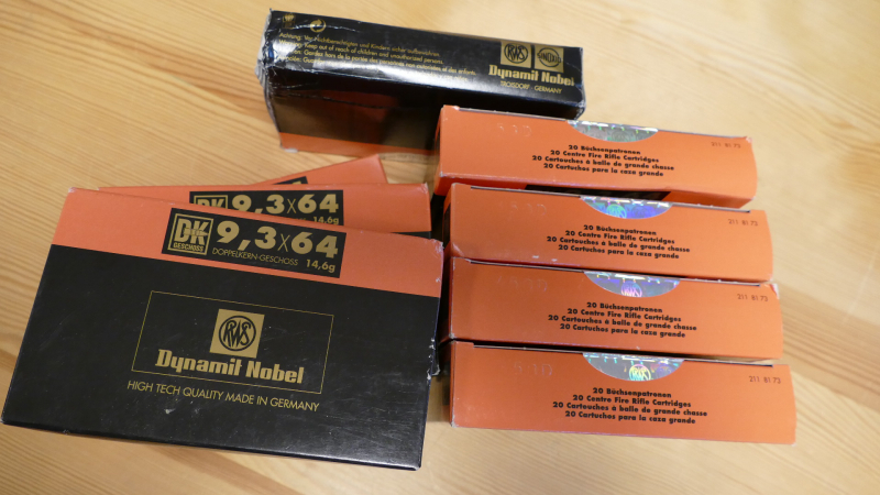 Aus Nachlass: 160 Stück (8 Pack) RWS 9,4x64, 225gr/14,6g Doppelkern, 2 Lose (4 Pack und 4 Pack), alle Packungen original verschlossen, daher konnte der Zustand der einzelnen Patronen nicht geprüft werden (da aber keine Feuchtigkeitsspuren zu sehen sind, gehe ich von einem einwandfreien Zustand aus, die Packungen sind teilweise schon etwas verdrückt).