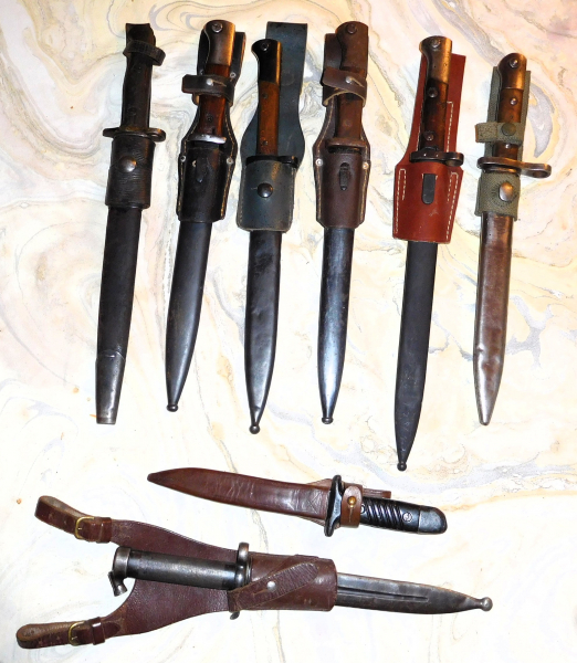 Zum Verkauf kommt ein Konvolut aus 12 Bajonetten (Kommissionsware), bestehend aus : 1 Bajonett Mod. 1907 GB,1944 gekürzt, für die australische OWEN Mpi, 1 deutsches Bajonett 84/98 (Export für Portugal), ohne Feuerschutzblech/Hersteller Carl Eickhorn Solingen, 1 deutsches Bajonett 84/98 (Export) , ohne Feuerschutzblech (flugrostig), ohne jede Markierung, wurde vom Vorbesitzer in Spanien angekauft, 1 CSR Bajonett VZ 24 (CSZ/S), 1 Bajonett MUSER M. 38 Türkei, 1 Kampfmesser Mod.53 Bulgarien (sehr selten) in Lederscheide, 1 Ganzstahlbajonett MAUSER M.96 Schweden mit Offizierskoppelschuh. Des weiteren kommen zum Verkauf : 2 Bajonette M.91/30 UdSSR in finnischen Lederscheiden, vom Vorbesitzer so in Helsinki angekauft, 1 indisches ENFIELD Bajonett Typ 1 Mk2, leider ohne Scheide 1944 in der Waffenfabrik ISHAPORE/Indien hergestellt, 2 britische Bajonette Typ SA 80, beide ohne zusätzliche Säge und Drahtschneider, in originaler