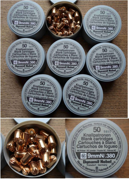 Zum Verkauf stehen 8 Dosen je 50 Schuss ( 400Stück) Knallpatronen im Kaliber 9mmN/.380 der Fa.Dynamit Nobel.
