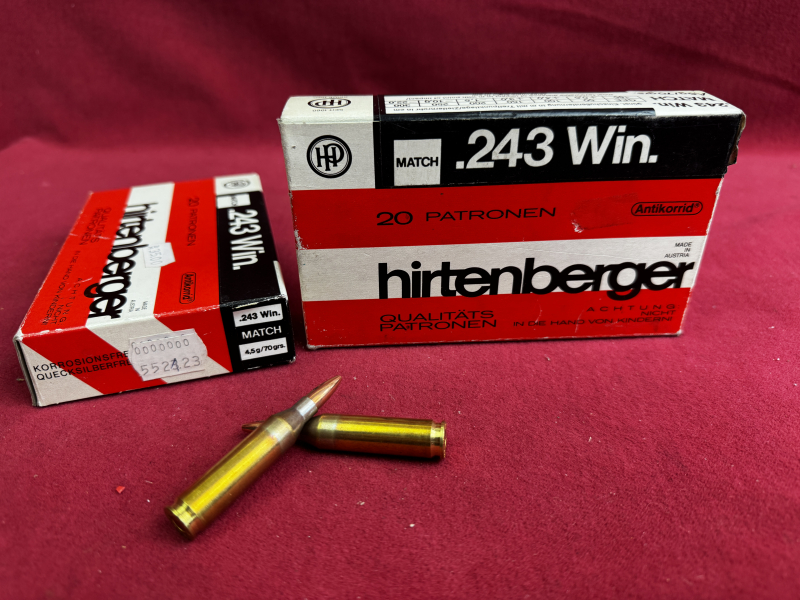 Es handelt sich hier um Hirtenberger .243Win MATCH Munition, 40 Schuss, 4,5 Gramm, 70 Grains, beider Packungen haben die selbe Losnummer