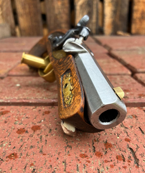 Zur Auktion kommt "kein schöner Derringer" von Ardesa im cal.45 . Staatlicher Beschuß vorhanden . Am Derringer wurde am Schaftholz gefräst , das Schloss wurde wohl lackiert und es wurden Hirschhornteile an der Kappe und vorne verarbeitet . Trockenfunktion gegeben , Lauf ist in Ordnung . Rest siehe Bilder .