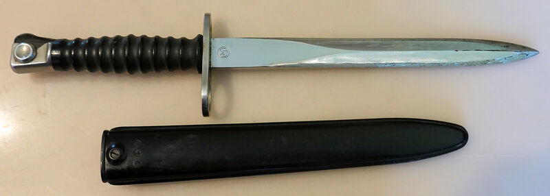 klinge beschliffen, Griff und Scheide aus Kunststoff, Klinge gestempelt mit W darunter 283910, auf der Scheide mehrere Stempel, die Klinge ist beschliffen, Gesamtlänge 36,7 cm